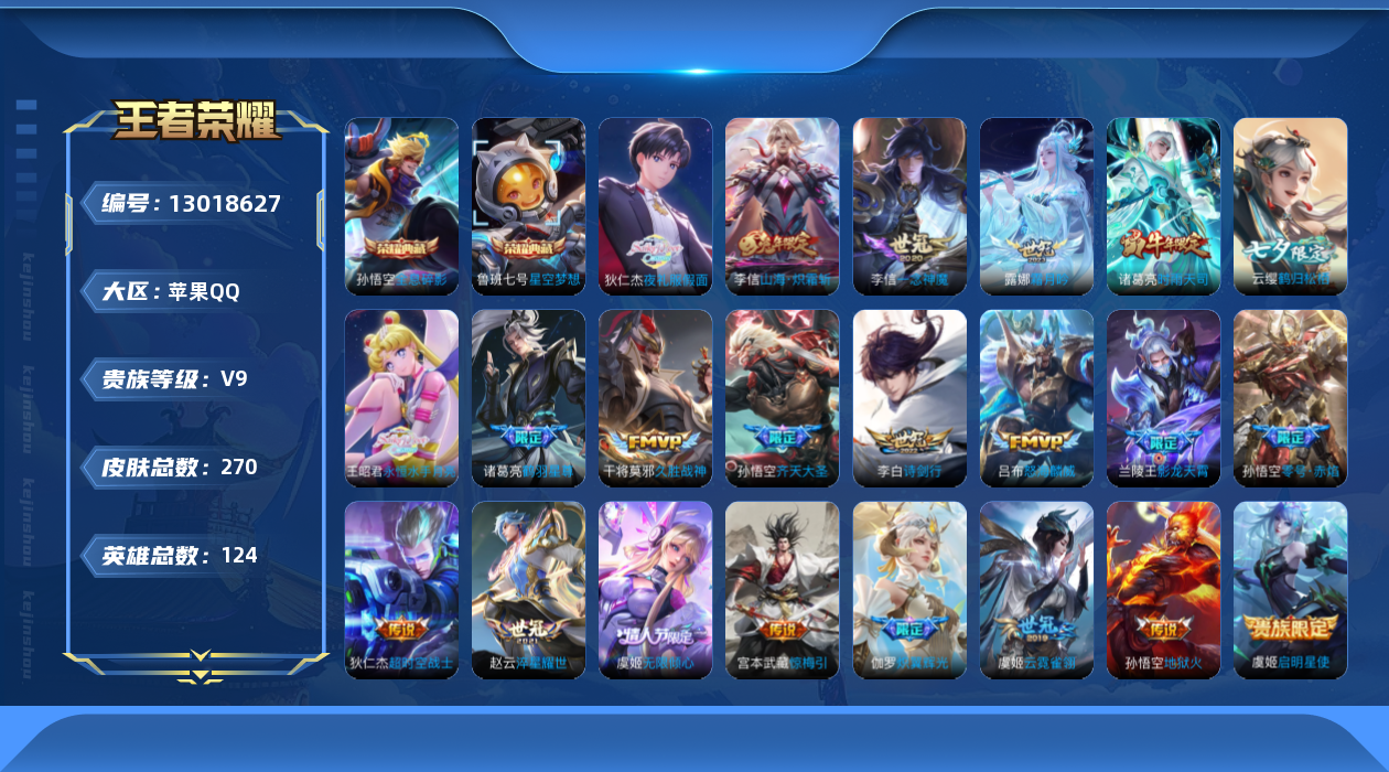 [13018627]苹果Q-V9-至尊星耀IV段位-124英雄-270皮肤-2典藏-0珍品无双-0无双-0珍品传说-23传说-62史诗