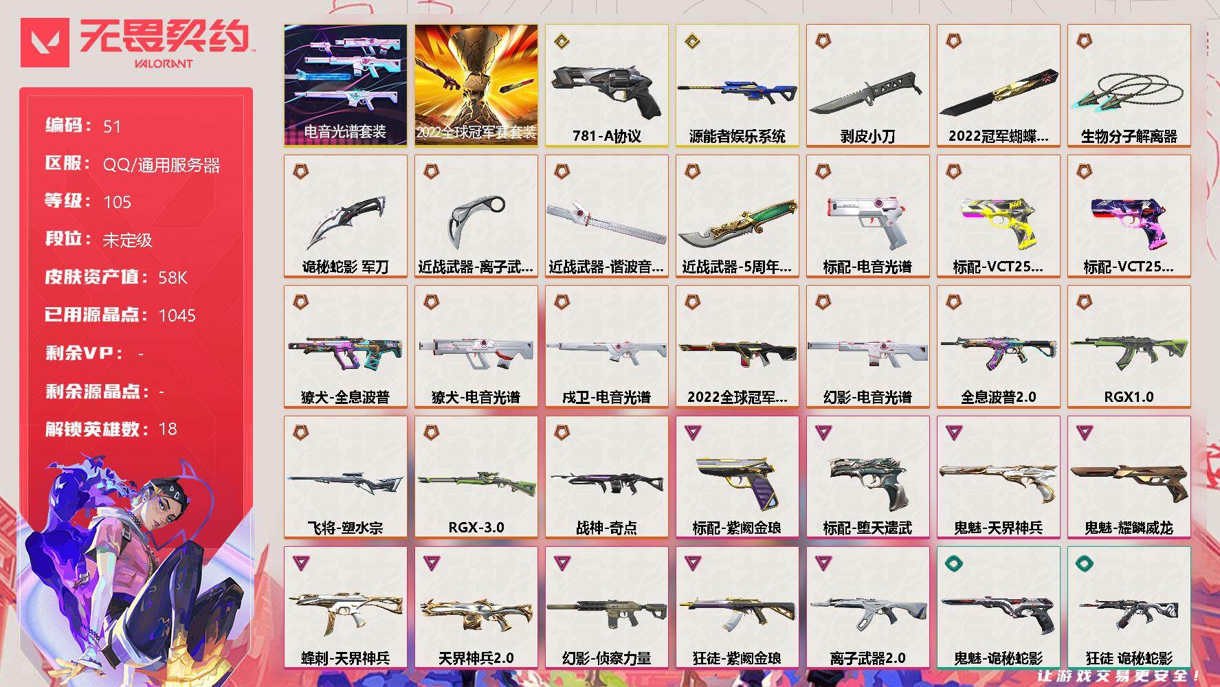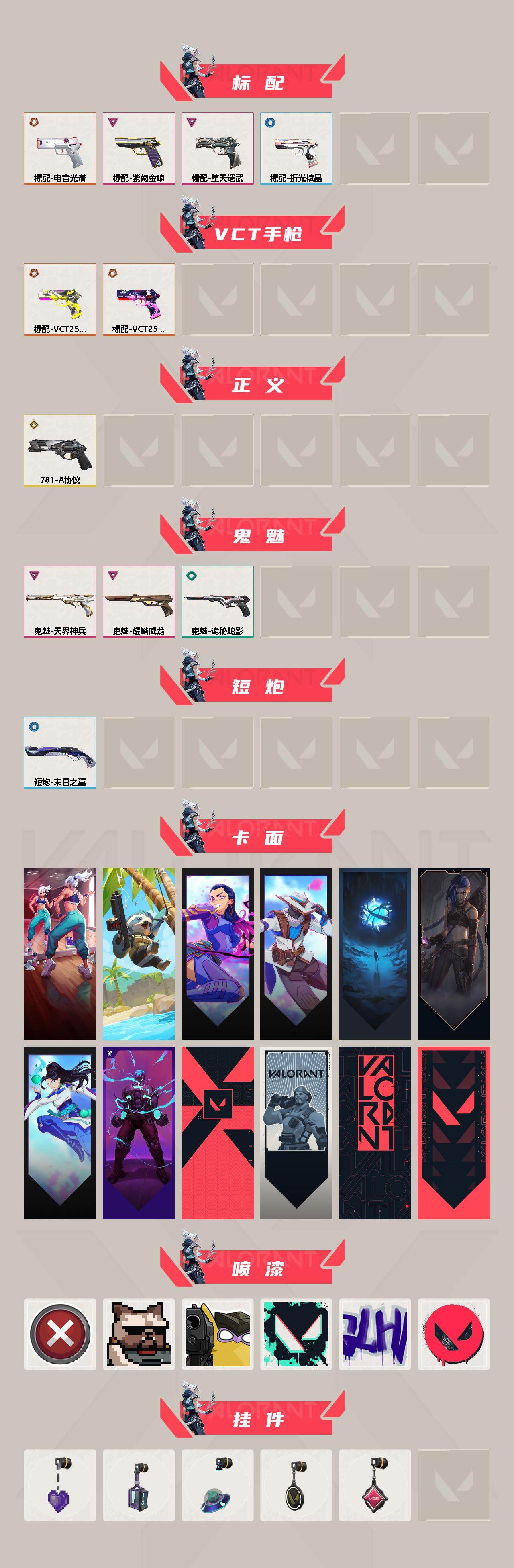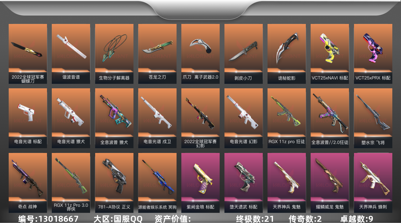 [13018667]【套装】:2022全球冠军赛套装,电音光谱套装 【英雄】:幻棱,炼狱,维斯,暮蝶,壹决,铁臂,捷风,幽影,不死鸟,贤者,猎枭,零,芮娜,奇乐,尚勃勒,夜露,盖可 【近战 武器】:近战武器-2022全球冠军赛 蝴蝶刀,近战武器-5周年//公测重制版 苍龙之刃,近战武器-谐波音谱,近战武器-剥皮小刀,近战武器-离子武器//2.0 爪刀,近战武器-生物分子解离器,近战武器-诡秘蛇影 军刀 【狂徒】:狂徒-全息波普//2.0,狂徒-RGX 11z Pro,狂徒-紫阙金琅,狂徒-离子武器//2.0,狂徒-诡秘蛇影 【幻影】:幻影-2022全球冠军赛,幻影-电音光谱,幻影-侦察力量,幻影-末日之翼,幻影-电音光谱 【戍卫】:戍卫-电音光谱,戍卫-折光棱晶,戍卫-电音光谱 【獠犬】:獠犬-全息波普,獠犬-电音光谱,獠犬-电音光谱 【冥驹】:冥驹-源能者娱乐系统 【飞将】:飞将-塑水宗,飞将-末日之翼 【莽侠】:莽侠-RGX 11z Pro//3.0,莽侠-诡秘蛇影 【战神】:战神-奇点 【奥丁】:奥丁-末日之翼 【判官】:判官-天界神兵//2.0,判官-诡秘蛇影 【蜂刺】:蜂刺-天界神兵,蜂刺-折光棱晶 【标配】:标配-电音光谱,标配-堕天遗武,标配-紫阙金琅,标配-折光棱晶,标配-电音光谱 【VCT手枪】:标配-VCT25 x NAVI,标配-VCT25 x PRX 【正义】:正义-781-A协议 【鬼魅】:鬼魅-天界神兵,鬼魅-耀鳞威龙,鬼魅-诡秘蛇影 【短炮】:短炮-末日之翼 【卡面】:热舞环节 卡面,树懒大作战 卡面,无畏契约GO!第一卷:芮娜 卡面,无畏契约GO!第一卷:零 卡面,无垠星环 卡面,《双城之战》金克丝 卡面,无畏契约GO!第一卷:贤者 卡面,势不可挡//K/O 卡面,代号红色 卡面,新兵报到 卡面,V契约 卡面,无畏契约 卡面 【喷漆】:买装还是存钱 喷漆,关门放狗 喷漆,放下武器 喷漆,胜利属于无畏契约 喷漆,GLHF 喷漆,无畏契约 喷漆 【挂饰】:V25第三幕:神话 挂饰,薰衣草之心 挂饰,动力机箱 挂饰,天外飞客 挂饰,无畏契约 纪念币 挂饰