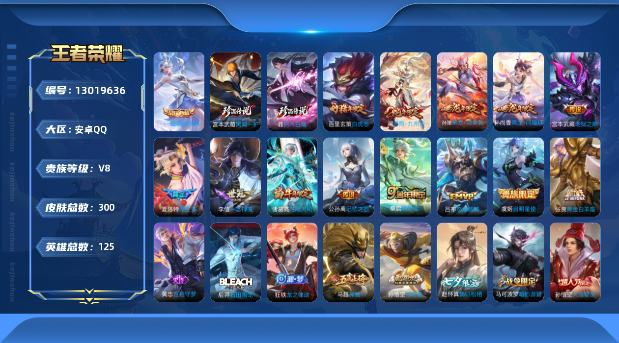 [13019636]安卓Q-V7-永恒钻石I段位-125英雄-300皮肤-1典藏-0珍品无双-0无双-2珍品传说-13传说-97史诗 【荣耀典藏】:伽罗最初的交响 【珍品传说】:暃朽木白哉,宫本武藏黑崎一护 【传说皮肤】:澜愿照九州拓,桑启鸣野蒿,孙尚香乘龙问璇玑,孙策乘龙淬吴钩,公孙离记忆之芯,夏洛特浮生妄,吕布怒海麟威,诸葛亮时雨天司,虞姬启明星使,李信一念神魔,张良黄金白羊座,百里玄策白虎志,宫本武藏地狱之眼 【限定皮肤】:姜子牙天穹之誓,狄仁杰阴阳师,赵云皇家上将,墨子神迹守卫,嬴政优雅恋人,嬴政白昼王子,孙尚香蔷薇恋人,鲁班七号狮舞东方,庄周高山流水,阿轲迷踪丽影,扁鹊奇幻香踪,芈月重明,芈月幻夜卜梦,吕布猎兽之王,周瑜赤莲之焰,元歌云间偶戏,夏侯惇朔风刀,曹操烛龙,典韦穷奇,马可波罗逐梦之星,马可波罗暗影游猎,狄仁杰魔术师,狄仁杰万华元夜,达摩星际陆战队,达摩沙漠行僧,项羽海滩派对,老夫子醍醐杖,老夫子航海奇遇记,程咬金演武夺筹,刘邦夺宝奇兵,韩信飞衡,兰陵王驯魔猎人,兰陵王金庭之子,花木兰瑞麟志,花木兰默契交锋,亚瑟潮玩骑士王,孙悟空大圣娶亲,孙悟空孙行者,牛魔御旌,后羿如梦令,后羿圣弓游侠,李元芳银河之约,虞姬启明星使,钟馗神迹守卫,钟馗驱傩正仪,杨玉环遇见飞天,杨戬潮玩骑兵,干将莫邪真爱魔法,雅典娜单词大作战,雅典娜黎明之约,蔡文姬繁星吟游,鬼谷子原初探秘者,诸葛亮时雨天司,黄忠火炮绅士,苏烈千军破阵,百里玄策白虎志,百里玄策原初追逐者,百里守约朱雀志,弈星混沌棋,沈梦溪星空之诺,沈梦溪匿光破解者,明世隐疑决卦,裴擒虎李小龙,裴擒虎擒涛扼浪,狂铁御狮,米莱狄御霄,米莱狄胡桃异想国,云中君纤云弄巧,盾山御銮,猪八戒西部大镖客,猪八戒猪悟能,上官婉儿梁祝,嫦娥拒霜思,西施玲珑珍味,蒙犽狂想玩偶喵,鲁班大师探海日志,镜匿光追影者,夏洛特浮生妄,戈娅驭风魔法,赵怀真鹤归松栖,阿古朵江河有灵,张良古海寻踪,蒙犽百解令,高渐离燃音魔法,妲己灵卜魔法,鬼谷子天穹祈灯,姬小满妄想食味,孙尚香乘龙问璇玑,孙策乘龙淬吴钩,沈梦溪龙舞盛年,刘邦剑破天穹,程咬金群星魔术团,周瑜熔金海岸 【年限皮肤】:百里玄策白虎志,百里守约朱雀志,花木兰瑞麟志,诸葛亮时雨天司,韩信飞衡,马超神威,孙尚香乘龙问璇玑,孙策乘龙淬吴钩 【赛季限定】:芈月重明,夏侯惇朔风刀,曹操烛龙,典韦穷奇,狄仁杰万华元夜,达