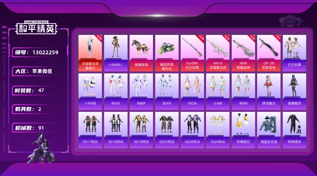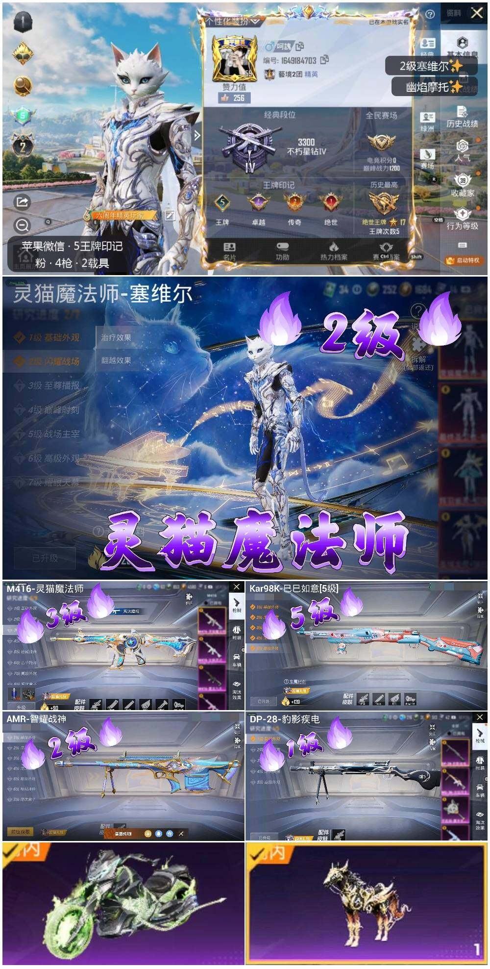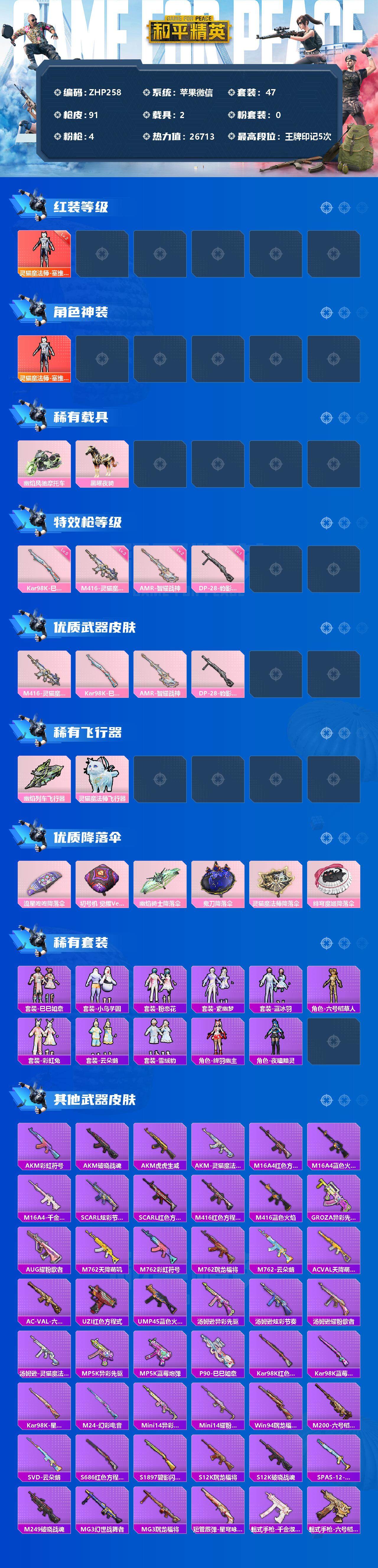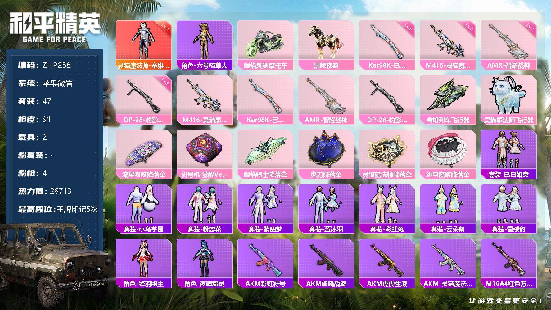 [13022259]2级塞维尔!稻草人!苹果 微信-1神装-0粉装-4特效枪-2载具-2粉色飞行器-26713热力值-5王牌印记-47套装-91枪皮 【红色神装等级】:灵猫魔法师-塞维尔(二级) 【红色角色神装】:灵猫魔法师-塞维尔 【热门品类】:角色-六号稻草人 【粉色载具】:幽焰风驰摩托车,黑曜夜骑 【粉色枪皮等级】:M416-灵猫魔法师(三级),Kar98K-巳巳如意(五级),AMR-智耀战神(二级),DP-28-豹影疾电(一级) 【粉色枪皮】:M416-灵猫魔法师,Kar98K-巳巳如意,AMR-智耀战神,DP-28-豹影疾电 【粉色飞行器】:幽焰列车飞行器,灵猫魔法师飞行器 【粉色降落伞】:流星咚咚降落伞,初号机 觉醒Ver.降落伞,幽焰骑士降落伞,鬼刀降落伞,灵猫魔法师降落伞,绯穹魔姬降落伞 【稀有套装】:套装-巳巳如意,套装-小鸟芋圆,套装-粉恋花,套装-紫幽梦,套装-蓝冰羽,角色-六号稻草人,套装-彩虹兔,套装-云朵鹅,套装-雪绒豹,角色-绛羽幽主,角色-夜瞳黯灵 【稀有枪皮】:AKM-彩虹符号,AKM-破晓战魂,AKM-虎虎生威,AKM-灵猫魔法师,M16A4-红色方程式,M16A4-蓝色火焰,M16A4-千金淑猫,SCAR-L-炫彩节奏,SCAR-L-红色方程式,M416-红色方程式,M416-蓝色火焰,GROZA-异彩先驱,AUG-耀粉歌者,M762-天降萌叽,M762-彩虹符号,M762-瑞龙福将,M762-云朵鹅,AC-VAL-天降萌叽,AC-VAL-六号稻草人,UZI-红色方程式,UMP45-蓝色火焰,汤姆逊-异彩先驱,汤姆逊-炫彩节奏,汤姆逊-耀粉歌者,汤姆逊-灵猫魔法师,MP5K-异彩先驱,MP5K-蓝莓炮弹,P90-巳巳如意,Kar98K-红色方程式,Kar98K-蓝莓炮弹,Kar98K-星穹咏叹调,M24-幻彩电音,Mini14-异彩先驱,Mini14-耀粉歌者,Win94-瑞龙福将,M200-六号稻草人,SVD-云朵鹅,S686-红色方程式,S1897-碧影闪光,S12K-瑞龙福将,S12K-破晓战魂,SPAS-12-云朵鹅,M249-破晓战魂,MG3-幻世战舞者,MG3-瑞龙福将,短管霰弹-星穹咏叹调,蝎式手枪-千金淑猫,蝎式手枪-六号稻草人,沙漠之鹰-云朵鹅,爆炸猎弓-喜羊羊与灰太狼,大砍刀-云朵鹅,撬棍-灵猫魔法师,破片手榴弹-巳巳如意 【