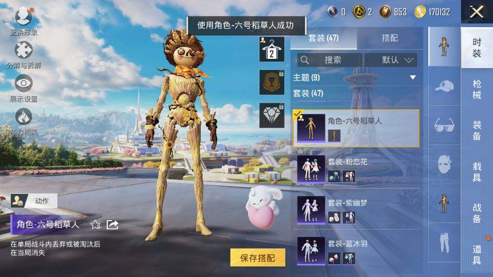 【稀有套装】:套装-巳巳如意,套装-小鸟芋圆,套装-粉恋花,套装-紫幽梦,套装-蓝冰羽,角色-六号稻草人,套装-彩虹兔,套装-云朵鹅,套装-雪绒豹,角色-绛羽幽主,角色-夜瞳黯灵