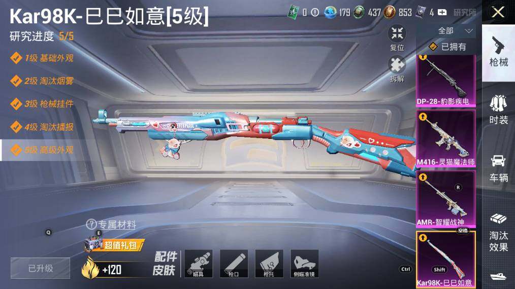 【粉色枪皮等级】:M416-灵猫魔法师(三级),Kar98K-巳巳如意(五级),AMR-智耀战神(二级),DP-28-豹影疾电(一级)