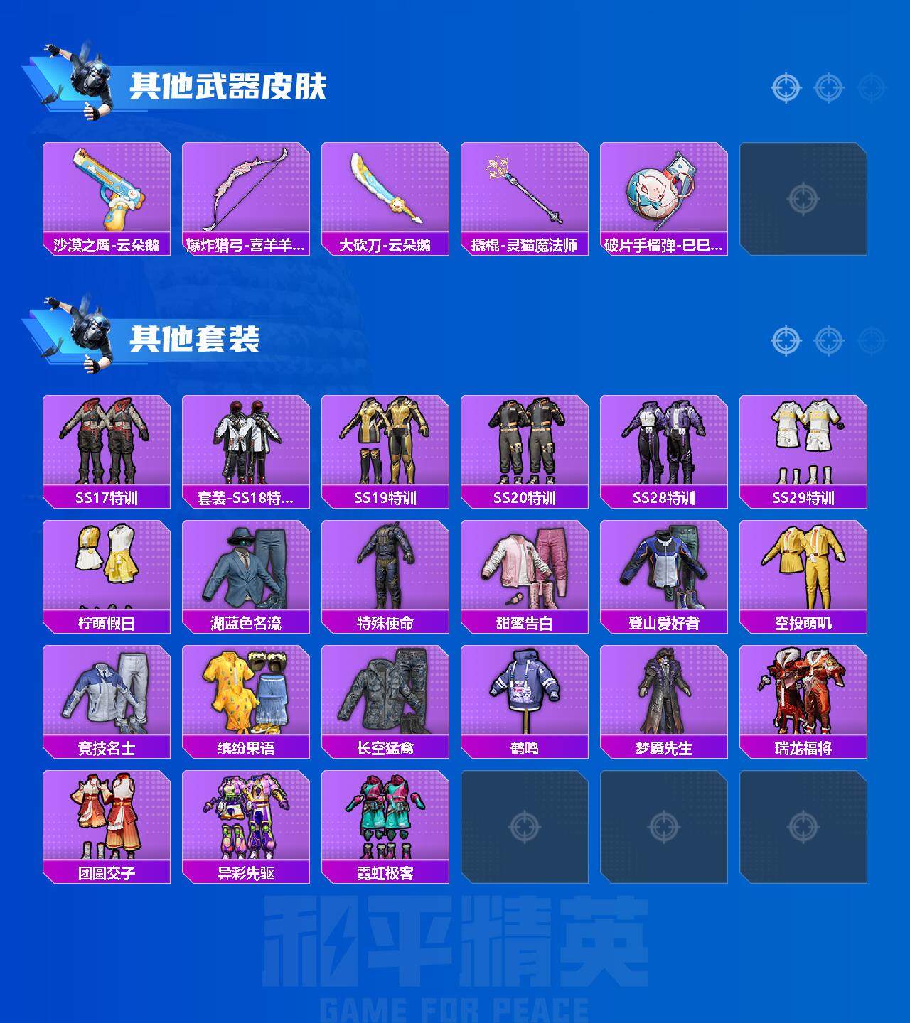 【稀有枪皮】:AKM-彩虹符号,AKM-破晓战魂,AKM-虎虎生威,AKM-灵猫魔法师,M16A4-红色方程式,M16A4-蓝色火焰,M16A4-千金淑猫,SCAR-L-炫彩节奏,SCAR-L-红色方程式,M416-红色方程式,M416-蓝色火焰,GROZA-异彩先驱,AUG-耀粉歌者,M762-天降萌叽,M762-彩虹符号,M762-瑞龙福将,M762-云朵鹅,AC-VAL-天降萌叽,AC-VAL-六号稻草人,UZI-红色方程式,UMP45-蓝色火焰,汤姆逊-异彩先驱,汤姆逊-炫彩节奏,汤姆逊-耀粉歌者,汤姆逊-灵猫魔法师,MP5K-异彩先驱,MP5K-蓝莓炮弹,P90-巳巳如意,Kar98K-红色方程式,Kar98K-蓝莓炮弹,Kar98K-星穹咏叹调,M24-幻彩电音,Mini14-异彩先驱,Mini14-耀粉歌者,Win94-瑞龙福将,M200-六号稻草人,SVD-云朵鹅,S686-红色方程式,S1897-碧影闪光,S12K-瑞龙福将,S12K-破晓战魂,SPAS-12-云朵鹅,M249-破晓战魂,MG3-幻世战舞者,MG3-瑞龙福将,短管霰弹-星穹咏叹调,蝎式手枪-千金淑猫,蝎式手枪-六号稻草人,沙漠之鹰-云朵鹅,爆炸猎弓-喜羊羊与灰太狼,大砍刀-云朵鹅,撬棍-灵猫魔法师,破片手榴弹-巳巳如意