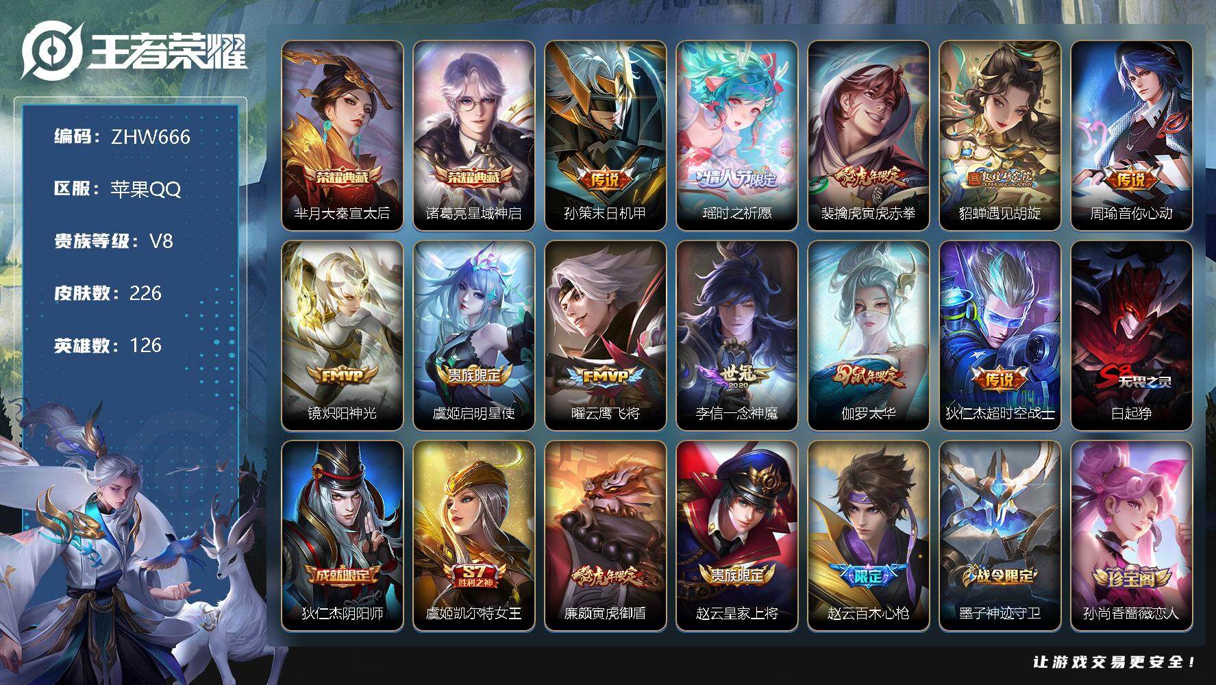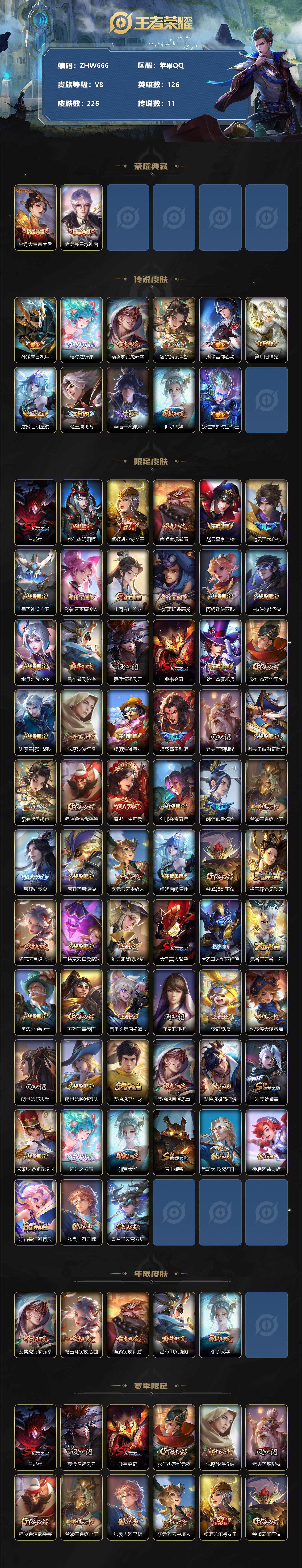 [13022306]苹果Q-V8-尊贵铂金II段位-126英雄-226皮肤-2典藏-11传说-70史诗