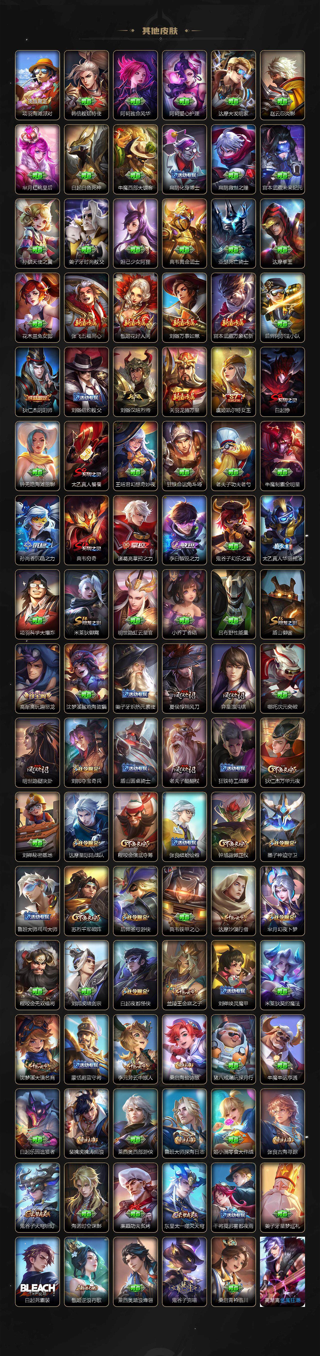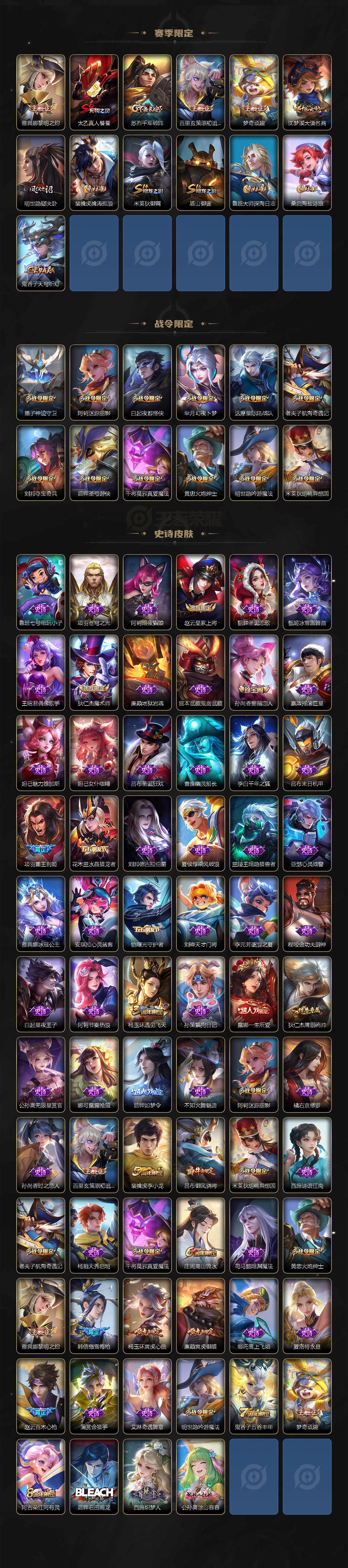 【赛季限定】:白起狰,夏侯惇朔风刀,典韦穷奇,狄仁杰万华元夜,达摩沙漠行僧,老夫子醍醐杖,程咬金演武夺筹,兰陵王金庭之子,张良古海寻踪,李元芳云中旅人,虞姬凯尔特女王,钟馗驱傩正仪,雅典娜黎明之约,太乙真人饕餮,苏烈千军破阵,百里玄策原初追逐者,弈星混沌棋,梦奇顽趣,沈梦溪大漠名商,明世隐疑决卦,裴擒虎擒涛扼浪,米莱狄御霄,盾山御銮,鲁班大师探海日志,桑启海盐诗旅,鬼谷子天穹祈灯