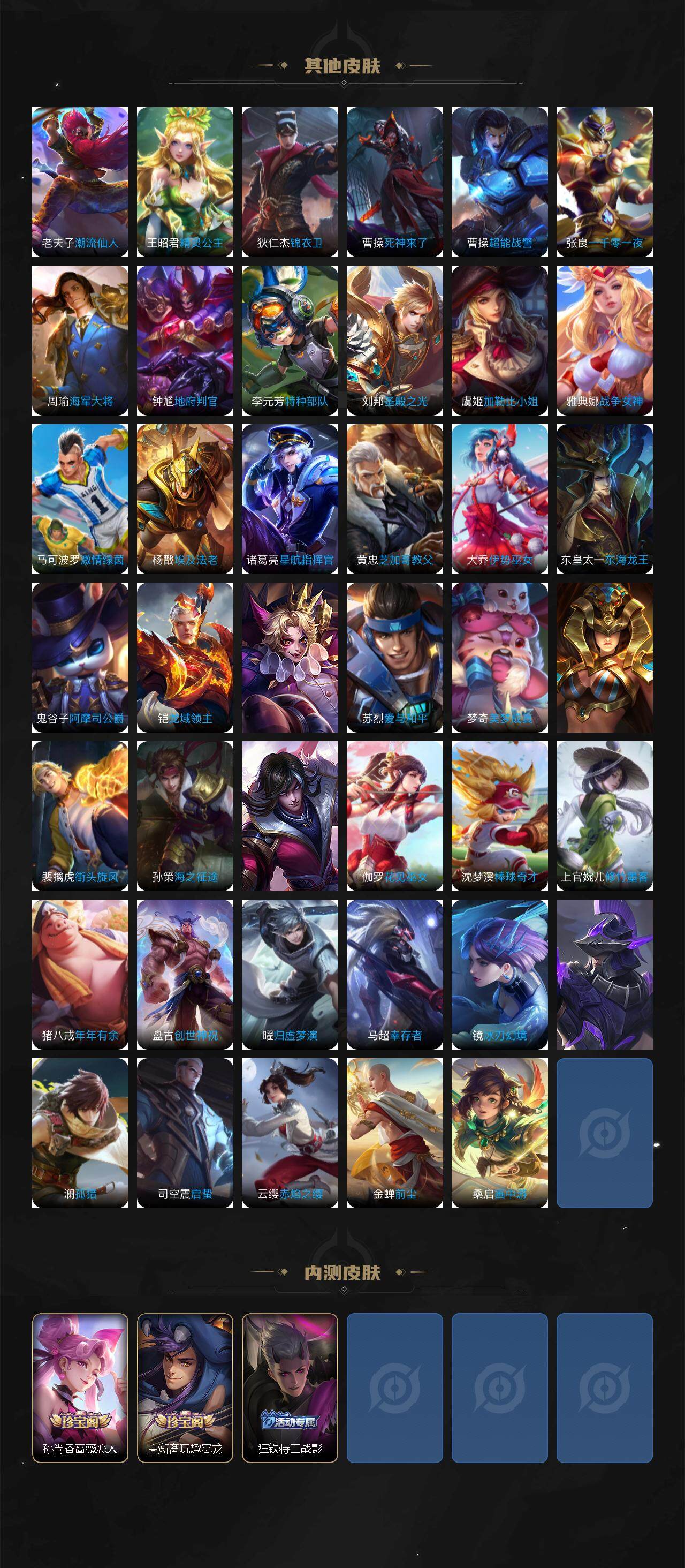 虞姬凯尔特女王,白起狰,太乙真人饕餮,典韦穷奇,米莱狄御霄,盾山御銮,夏侯惇朔风刀,明世隐疑决卦,老夫子醍醐杖,狄仁杰万华元夜,程咬金演武夺筹,钟馗驱傩正仪,苏烈千军破阵,刘邦夺宝奇兵,弈星混沌棋,达摩沙漠行僧,兰陵王金庭之子,沈梦溪大漠名商,李元芳云中旅人,桑启海盐诗旅,裴擒虎擒涛扼浪,鲁班大师探海日志,张良古海寻踪