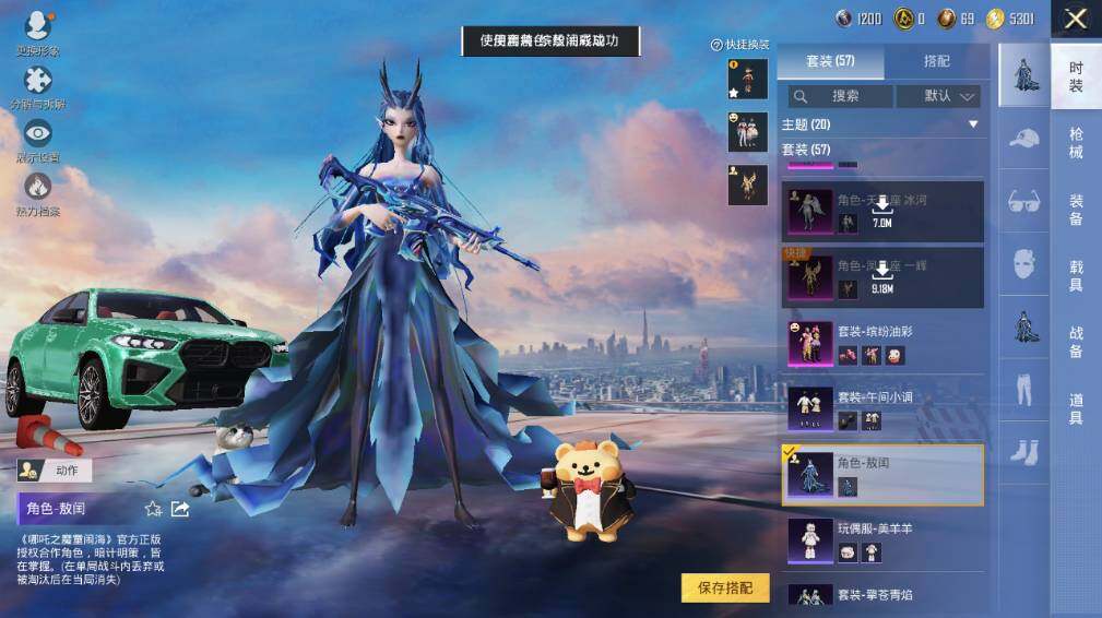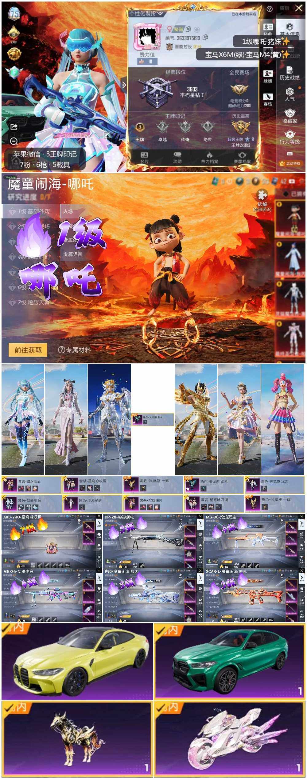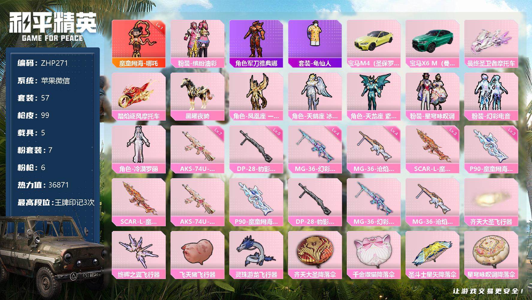 [13022307]一级哪吒!苹果 微信-1神装-7粉装-6特效枪-5载具-4粉色飞行器-36871热力值-3王牌印记-57套装-99枪皮