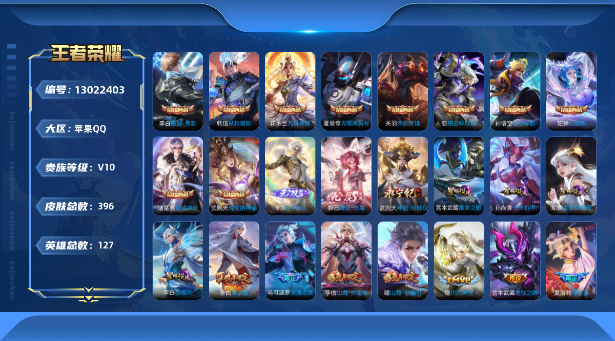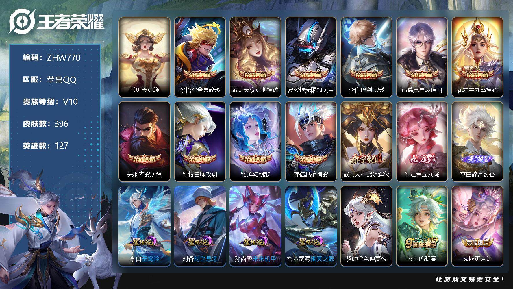 [13022403]苹果Q-V10-最强王者段位-127英雄-396皮肤-10典藏-3无双-0珍品传说-57传说-112史诗-5星元