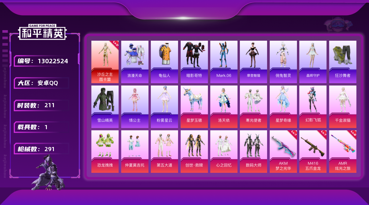 [13022524]素材身法号/绝世印记1/地铁满天赋 安卓 手Q-1神装-12粉装-13特效枪-1载具-6粉色飞行器-9.8w热力值-18王牌印记-211套装-291枪皮【红色神装等级】:沙丘之主-图卡盟(二级)【热门品类】:粉装-梦幻火箭,套装-浪漫天命,套装-派对舞王,套装-深海小丑鱼,套装-小丑鱼,套装-龟仙人,套装-暗影哥特,角色-Mark.06【粉色载具】:星梦玉骢【粉色套装】:粉装-数码大师,粉装-梦幻火箭,角色-洛天依,粉装-恐龙拽拽,粉装-寒光使者,粉装-第五大道,粉装-心之回忆,粉装-仲夏莫吉托,套装-创世·救赎,角色-星梦奇缘,角色-千金淑猫,粉装-幻影飞狐【粉色枪皮等级】:AKM-梦之光华(七级),SCAR-L-锦绣绵绵(五级),M416-五爪金龙(七级),M416-墨龙九天(三级),GROZA-镜光银凌(五级),AUG-暖羊咩咩(五级),P90-沙丘之主(三级),P90-金丰海韵(五级),Kar98K-巳巳如意(五级),M24-镜域双华(三级),AMR-炫光之旅(六级),DP-28-豹影疾电(五级),MG3-洛神天依(五级)【粉色飞行器】:歌者泠鸢飞行器,沙丘之主天马,镜域双华-灵镜之阶,龙翔九天飞行器,英伦信使飞行器,凤舞九天飞行器