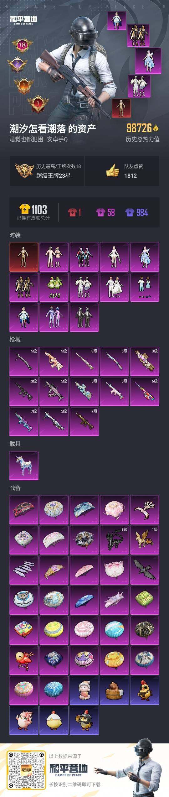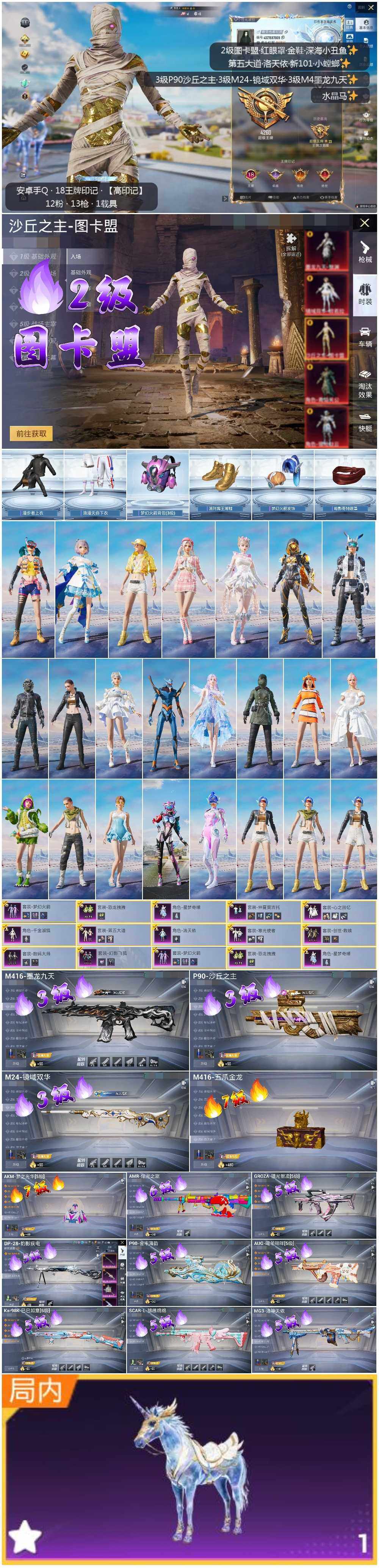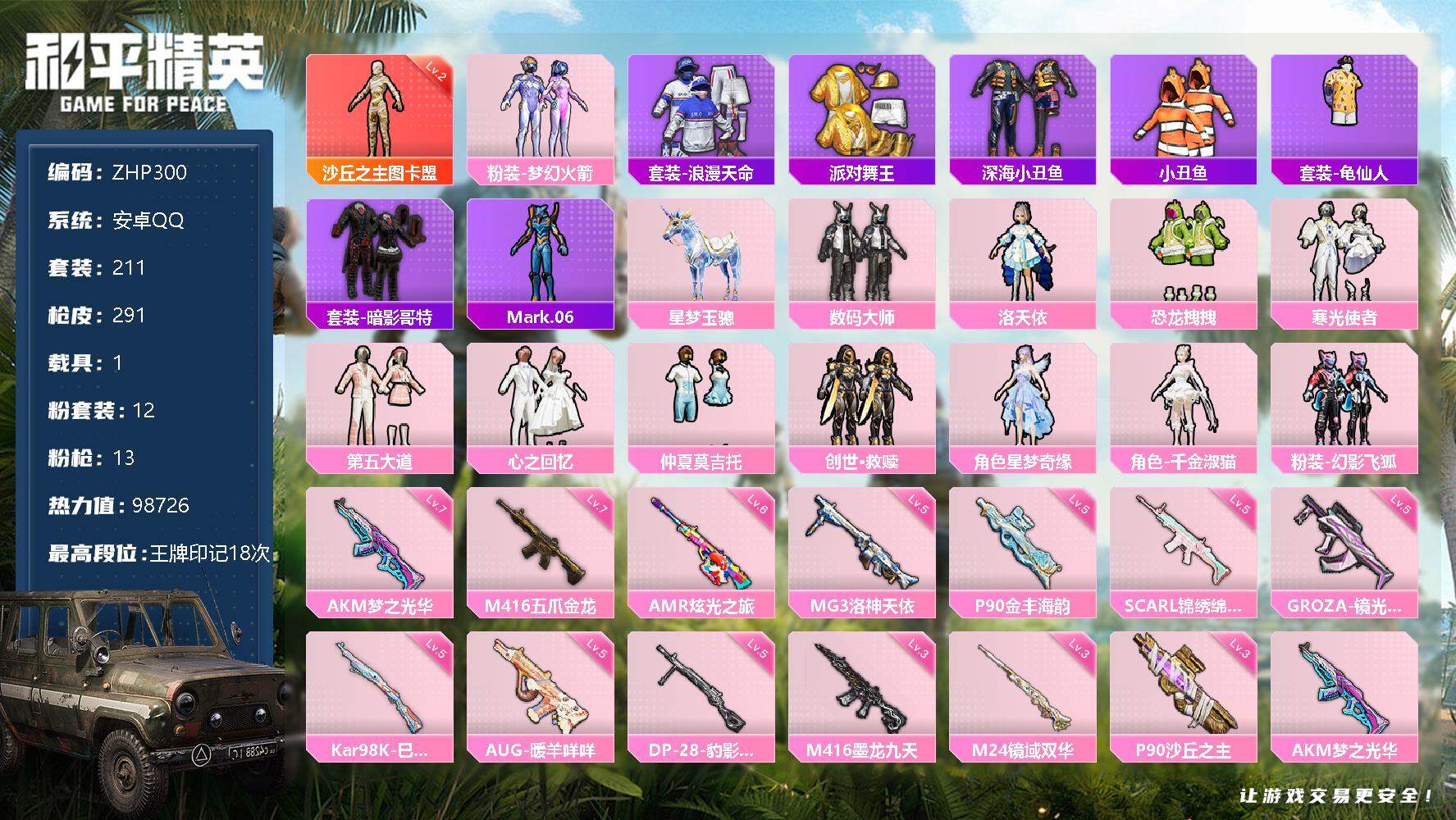 - PX_2083208- 苹果手Q-18王牌印记-7粉装-6特效枪-2载具-77082热力值-169套装-236枪皮-2卓越印记-1传奇印记 【7粉装】,梦幻火箭,宝贝奶油派,天使彩虹糖,洛天依,千金淑猫,沙场疾风,极限特训 【6特效枪】AKM-星际浪客-7级 SCAR-L-青春物语-6级 M416-至情至圣-7级 M416-风花雪月-5级 AUG-暖羊咩咩-5级 Kar98K-巳巳如意-5级 【