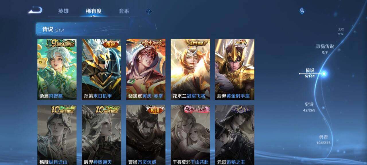 【传说皮肤】:桑启鸣野蒿,孙策末日机甲,裴擒虎寅虎赤拳,花木兰冠军飞将,后羿黄金射手座