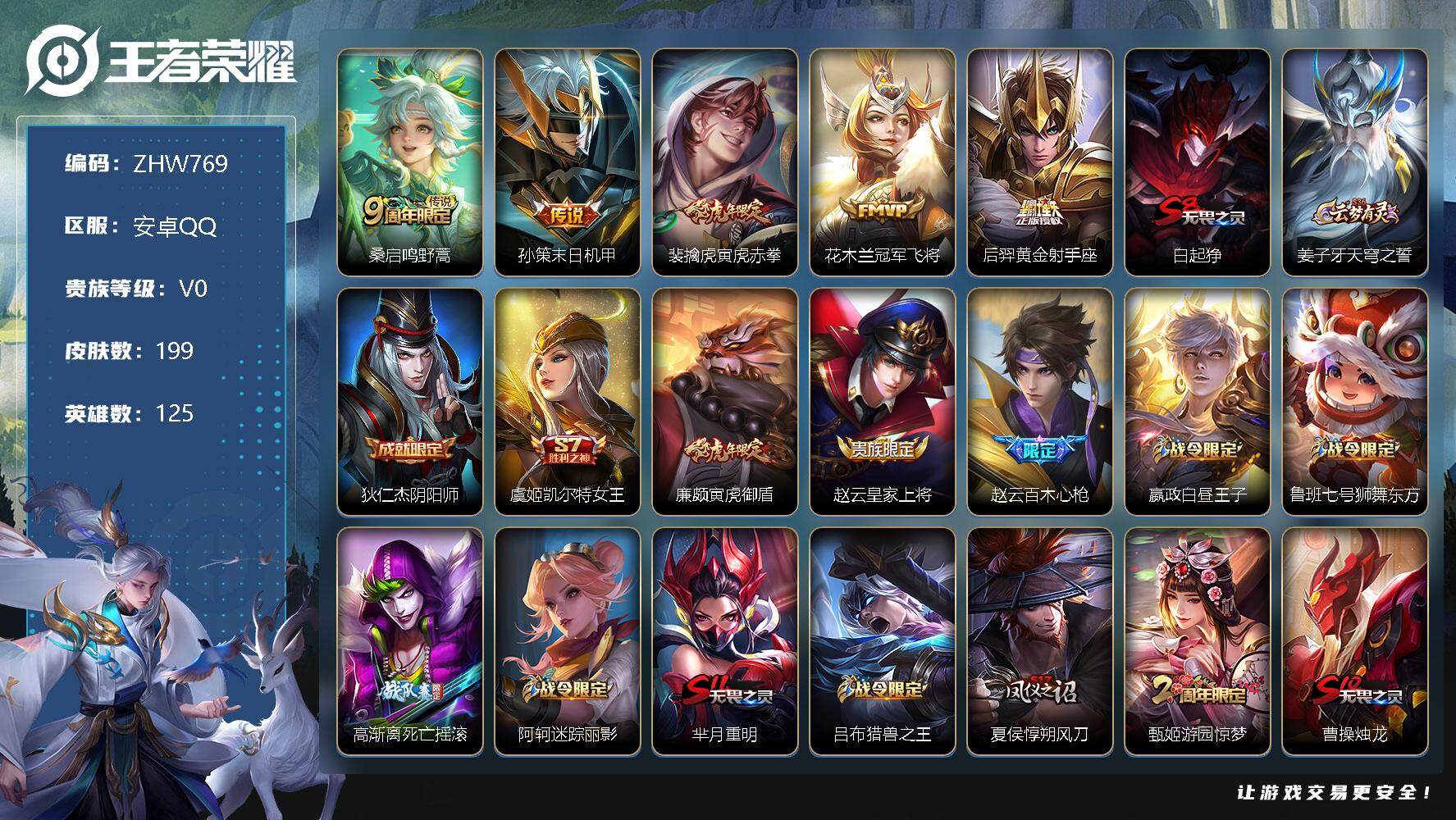 [13022437]安卓Q-V0-至尊星耀IV段位-125英雄-199皮肤-5传说-42史诗 【传说皮肤】:桑启鸣野蒿,孙策末日机甲,裴擒虎寅虎赤拳,花木兰冠军飞将,后羿黄金射手座 【限定皮肤】:白起狰,姜子牙天穹之誓,狄仁杰阴阳师,虞姬凯尔特女王,廉颇寅虎御盾,赵云皇家上将,赵云百木心枪,嬴政白昼王子,鲁班七号狮舞东方,高渐离死亡摇滚,阿轲迷踪丽影,芈月重明,吕布猎兽之王,夏侯惇朔风刀,甄姬游园惊梦,曹操烛龙,典韦穷奇,典韦蓝屏警告,狄仁杰魔术师,狄仁杰万华元夜,达摩沙漠行僧,项羽海滩派对,老夫子醍醐杖,刘邦夺宝奇兵,兰陵王金庭之子,孙悟空美猴王,孙悟空大圣娶亲,牛魔御旌,李元芳云中旅人,钟馗神迹守卫,杨玉环遇见飞天,女娲朔望之晖,太乙真人饕餮,黄忠烈魂,百里玄策原初追逐者,百里守约朱雀志,弈星混沌棋,梦奇顽趣,沈梦溪大漠名商,明世隐疑决卦,裴擒虎李小龙,裴擒虎寅虎赤拳,裴擒虎擒涛扼浪,狂铁御狮,米莱狄御霄,盾山御銮,嫦娥拒霜思,鲁班大师探海日志,桑启海盐诗旅,阿古朵江河有灵,张良古海寻踪,蒙恬荣光圣徽,鬼谷子天穹祈灯,姬小满妄想食味,刘邦剑破天穹,程咬金群星魔术团,周瑜熔金海岸 【年限皮肤】:百里守约朱雀志,孙悟空美猴王,裴擒虎寅虎赤拳,廉颇寅虎御盾,黄忠烈魂 【赛季限定】:白起狰,芈月重明,夏侯惇朔风刀,曹操烛龙,典韦穷奇,狄仁杰万华元夜,达摩沙漠行僧,老夫子醍醐杖,兰陵王金庭之子,张良古海寻踪,牛魔御旌,李元芳云中旅人,虞姬凯尔特女王,太乙真人饕餮,百里玄策原初追逐者,弈星混沌棋,梦奇顽趣,沈梦溪大漠名商,明世隐疑决卦,裴擒虎擒涛扼浪,狂铁御狮,米莱狄御霄,盾山御銮,鲁班大师探海日志,桑启海盐诗旅,鬼谷子天穹祈灯,蒙恬荣光圣徽,刘邦剑破天穹,姜子牙天穹之誓 【战令限定】:嬴政白昼王子,鲁班七号狮舞东方,阿轲迷踪丽影,吕布猎兽之王,典韦蓝屏警告,刘邦夺宝奇兵,钟馗神迹守卫,女娲朔望之晖 【史诗皮肤】:鲁班七号电玩小子,赵云皇家上将,甄姬冰雪圆舞曲,狄仁杰魔术师,宫本武藏鬼剑武藏,嬴政暗夜贵公子,妲己魅力维加斯,墨子龙骑士,吕布末日机甲,张飞乱世虎臣,花木兰水晶猎龙者,刘邦德古拉伯爵,夏侯惇乘风破浪,小乔缤纷独角兽,兰陵王暗隐猎兽者,甄姬游园惊梦,安琪拉心灵骇客,百里守约特工魅影,刘禅天才门将,李元芳逐浪之夏,杨玉环遇见飞天,嬴政白昼王子,百里守约朱雀志,孙悟空大圣娶亲,典韦蓝屏