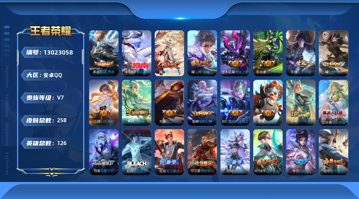 [13023058]安卓Q-V7-至尊星耀II段位-126英雄-254皮肤-1典藏-0珍品无双-0无双-1珍品传说-11传说-67史诗