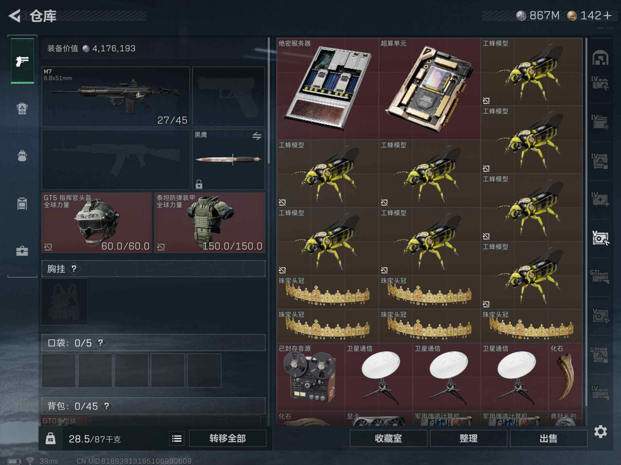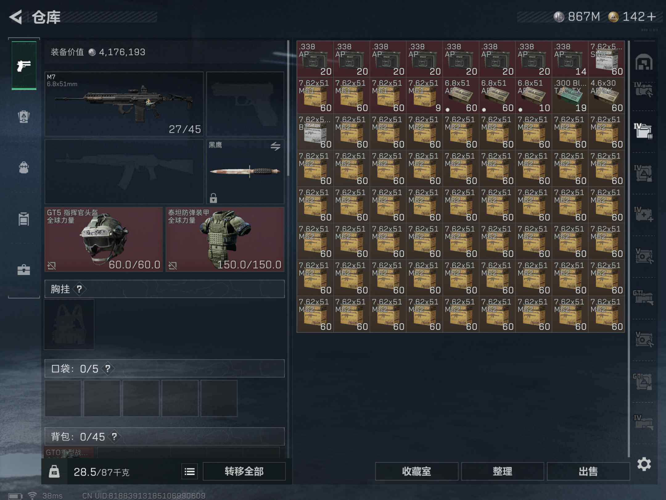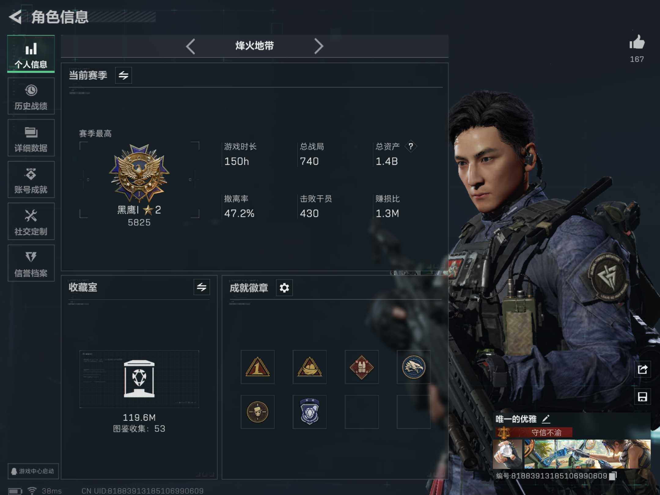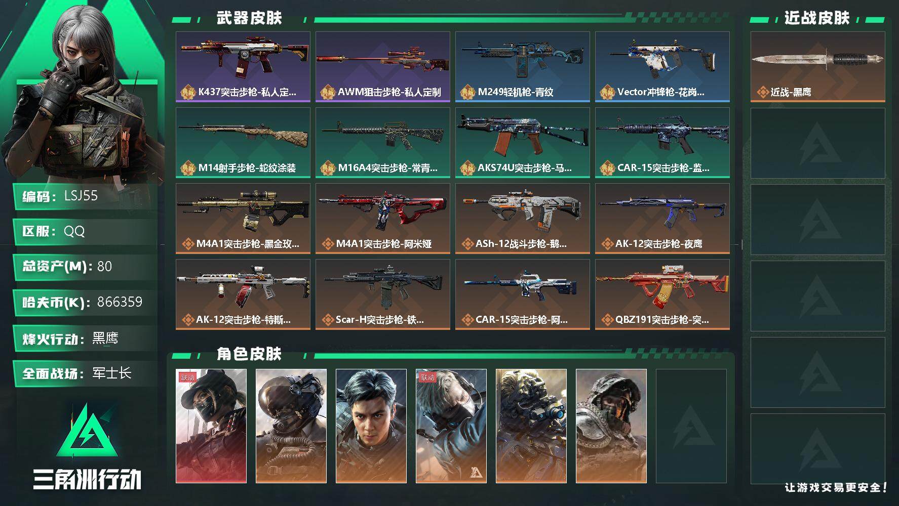 [13023191]总价值1.5b 866359k哈伏币-1176m流动资产-60烽火等级-黑鹰-48战场等级-军士长 【干员外观】:露娜-黑·天际线,威龙-壮志凌云,威龙-飞虎,蜂医-送葬人·无题密令,无名-夜鹰,深蓝-不破誓约 【近战皮肤】:近战-黑鹰 【典藏外观】:K437突击步枪-私人定制,AWM狙击步枪-私人定制,M249轻机枪-青纹,Vector冲锋枪-花岗岩,M14射手步枪-蛇纹涂装,M16A4突击步枪-常青藤,AKS-74U突击步枪-马赛克涂装,CAR-15突击步枪-监察 【传说级普通外观】:M4A1突击步枪-蚀金玫瑰,M4A1突击步枪-阿米娅,ASh-12战斗步枪-鹅鸭杀,AK-12突击步枪-夜鹰,AK-12突击步枪-特斯拉线圈,SCAR-H战斗步枪-铁艺苍穹,CAR-15突击步枪-阿米娅,腾龙突击步枪-捞点薯条,UZI冲锋枪-特斯拉线圈,SMG-45冲锋枪-骑士,SR-3M紧凑突击步枪-特斯拉线圈,QCQ171冲锋枪-鹅鸭杀,725双管霰弹枪-送葬人-无题密令,M250通用机枪-骑士之心,QJB201轻机枪-鹅鸭杀,SR-25射手步枪-水墨云图,AWM狙击步枪-捞点薯条,G18-飞虎,93R-捞点薯条,复合弓-黑·天际线 【史诗级普通外观】:M4A1突击步枪-特勤执行,AKM突击步枪-林中猎手,QBZ95-1突击步枪-曙光,QBZ95-1突击步枪-ACE,ASh-12战斗步枪-守夜人,M16A4突击步枪-竞赛选手,AUG突击步枪-蝮蛇,AUG突击步枪-特勤执行,SG552突击步枪-尖端治疗,SG552突击步枪-深海恐惧,SCAR-H战斗步枪-囚徒,G3战斗步枪-战场英杰,PTR-32突击步枪-ACE,AS Val突击步枪-刀锋,AS Val突击步枪-尖端治疗,腾龙突击步枪-无垢,MP5冲锋枪-深海恐惧,Vector冲锋枪-阿萨拉文明,Vector冲锋枪-红色彗星,SR-3M紧凑突击步枪-英雄,SR-3M紧凑突击步枪-荒野求生,勇士冲锋枪-深海恐惧,MP7冲锋枪-无垢,M1014霰弹枪-林中猎手,S12K霰弹枪-曙光,PKM通用机枪-蝮蛇,PKM通用机枪-守夜人,PKM通用机枪-荒野求生,M250通用机枪-囚徒,SVD狙击步枪-阿萨拉工艺,SVD狙击步枪-暗夜猎手,SVD狙击步枪-荒野求生,SKS射手步枪-ACE,SR-25射手步枪-尖端治疗,PSG-1射手步枪-