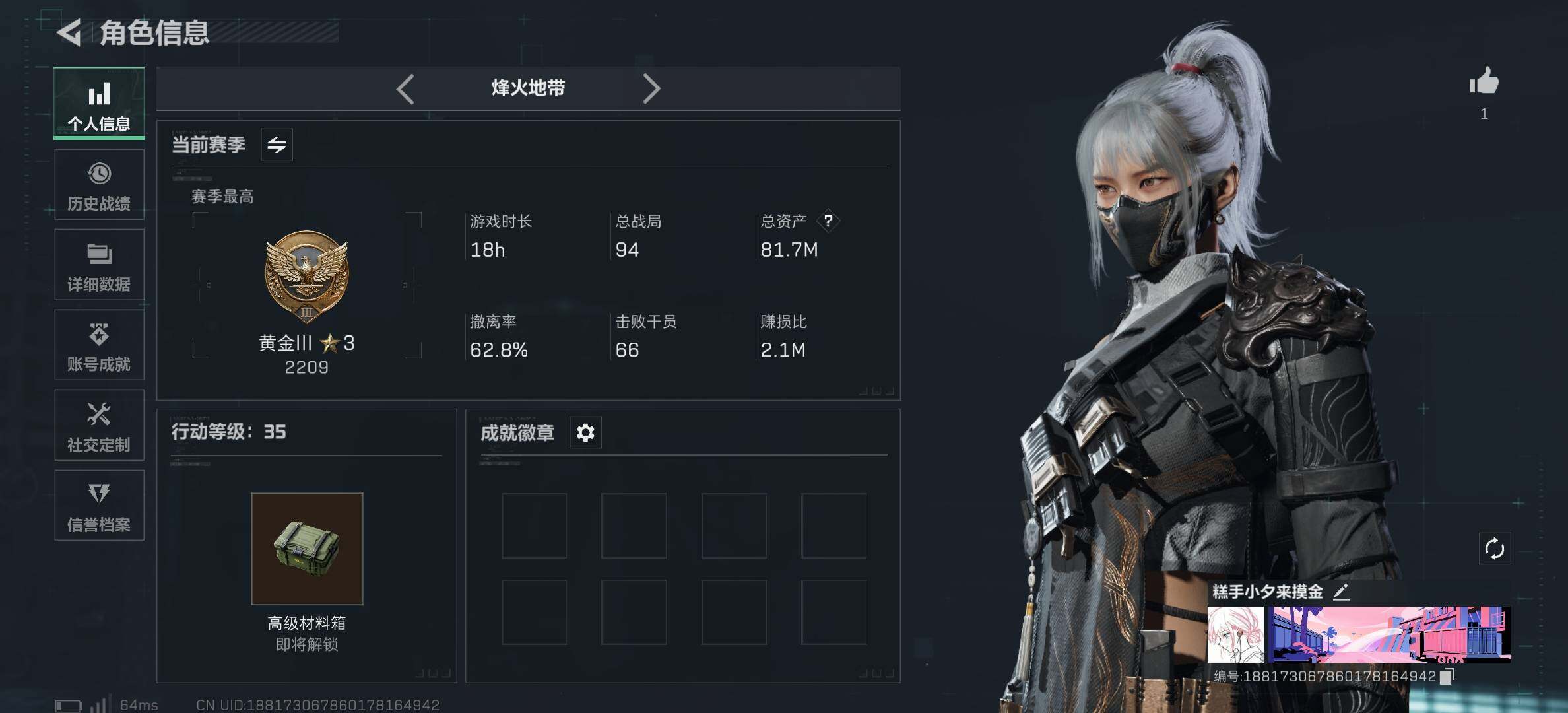 - [11818010]总资产:666.5M 1近战传说 12传说枪械 哈夫币:500K 高级安全箱(2×3)9.15号到期 可二次 可修改实名 永久限制所有社交场景 优质装备:近战-黑海 烽火地带段位:钻石 全面战场段位:无段位 传说武器皮肤:UZI冲锋枪-特斯拉线圈,AWM狙击步枪-捞点薯条,腾龙突击步枪-捞点薯条,93R-捞点薯条,AK-12突击步枪-特斯拉线圈,SR-3M紧凑突击步枪-特斯拉线圈,勇士冲锋枪-能天使-午夜邮差,725双管霰弹枪-送葬人-无题密令,M4A1突击步枪-阿米娅,CAR-15突击步枪-阿米娅,AK-12突击步枪-夜鹰