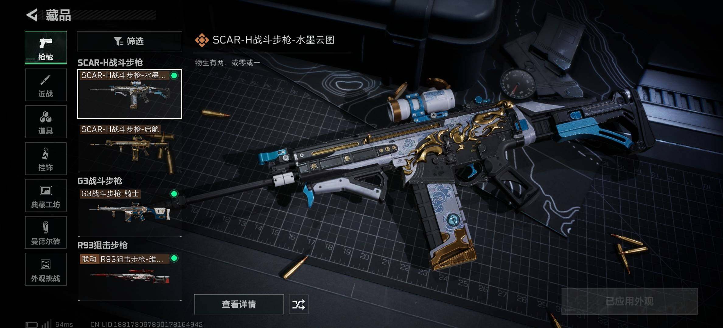 [13023261]总资产81.7m【干员外观】:骇爪-维什戴尔,骇爪-水墨云图 【传说级普通外观】:SCAR-H战斗步枪-水墨云图,R93狙击步枪-维什戴尔