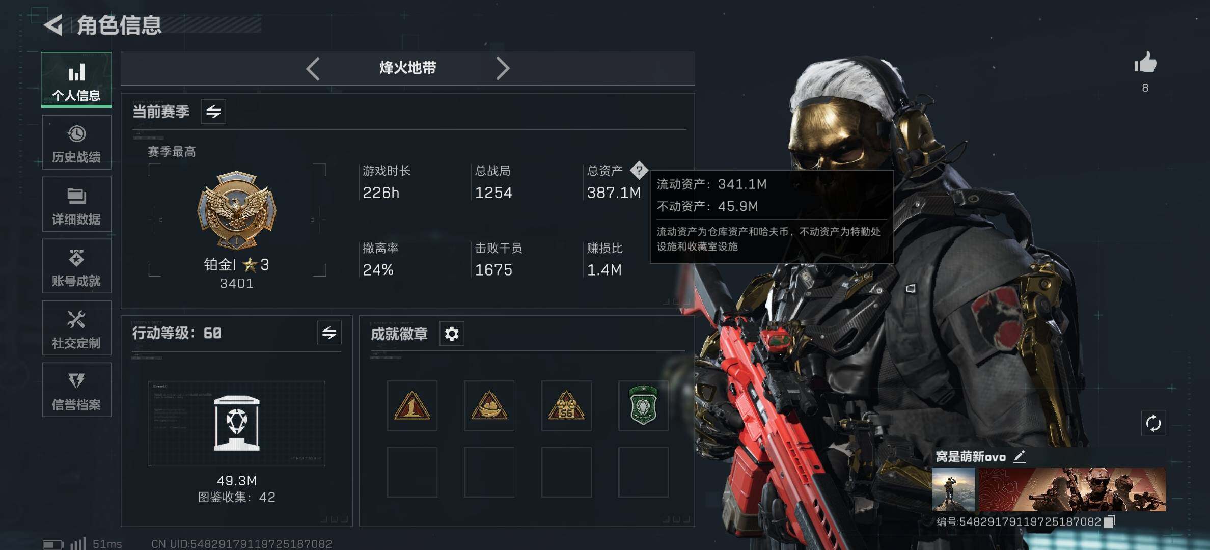 [13023303]387m总资产 248726k哈伏币-295m流动资产-60烽火等级-铂金-1战场等级-无军衔