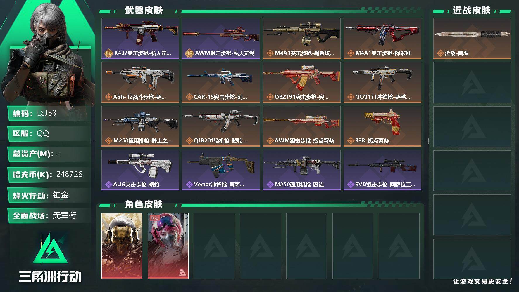 [13023303]387m总资产 248726k哈伏币-295m流动资产-60烽火等级-铂金-1战场等级-无军衔 【干员外观】:红狼-蚀金玫瑰,蛊-能天使午夜邮差 【近战皮肤】:近战-黑鹰 【典藏外观】:K437突击步枪-私人定制,AWM狙击步枪-私人定制 【传说级普通外观】:M4A1突击步枪-蚀金玫瑰,M4A1突击步枪-阿米娅,ASh-12战斗步枪-鹅鸭杀,CAR-15突击步枪-阿米娅,腾龙突击步枪-捞点薯条,QCQ171冲锋枪-鹅鸭杀,M250通用机枪-骑士之心,QJB201轻机枪-鹅鸭杀,AWM狙击步枪-捞点薯条,93R-捞点薯条 【史诗级普通外观】:AUG突击步枪-蝮蛇,Vector冲锋枪-阿萨拉文明,M250通用机枪-囚徒,SVD狙击步枪-阿萨拉工艺,SV-98狙击步枪-林中猎手 【稀有级普通外观】:K416突击步枪-碳纤维,M7战斗步枪-前沿科技,SCAR-H战斗步枪-荣耀列队,MP5冲锋枪-弄臣,MP5冲锋枪-虎啸,Vector冲锋枪-先锋,SMG-45-行动开启,SMG-45冲锋枪-幻影结构,M1014霰弹枪-幻影结构,Mini-14射手步枪-荣耀列队,SVD狙击步枪-战术行动,SKS射手步枪-弄臣,SR-25射手步枪-开拓,SR-9射手步枪-街头涂鸦,SV-98狙击步枪-星链科技 【普通级普通外观】:M4A1突击步枪-粉色涂装,M4A1突击步枪-海色,QBZ95-1突击步枪-海浪,QBZ95-1突击步枪-海色,K416突击步枪-高雅黑,M16A4突击步枪-山林猎人,M7战斗步枪-红色涂装,SG552突击步枪-浅蓝涂装,SG552突击步枪-海浪,SCAR-H战斗步枪-数码迷彩,G3战斗步枪-高雅黑,PTR-32突击步枪-黄蜂,MP5冲锋枪-安全工作,MP5冲锋枪-海色,MP5冲锋枪-黄蜂,P90冲锋枪-安全工作,Vector冲锋枪-几何迷彩,UZI冲锋枪-海色,QCQ171冲锋枪-三角洲力量,M1014霰弹枪-高雅黑,M1014霰弹枪-海浪,PKM通用机枪-彩墨喷涂,M249轻机枪-黄蜂,QJB201轻机枪-三角洲力量,SR-25射手步枪-黄蜂,SV-98狙击步枪-红色涂装,沙漠之鹰-海浪 【军牌】:军牌-捞点薯条,军牌-猫咪,军牌-永恒,军牌-零号大坝,军牌-来点薯条,军牌-修整,军牌-信誉优秀,军牌-小心鳄鱼 【挂饰】:挂饰-黑金玫瑰,挂饰-来点薯条,挂饰-阿萨