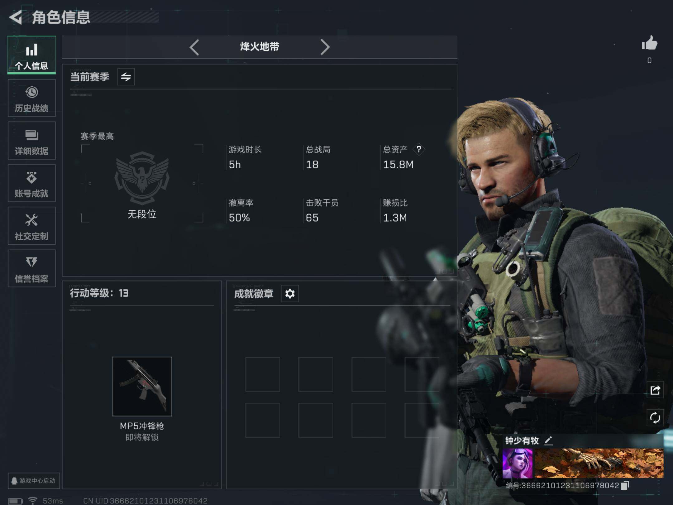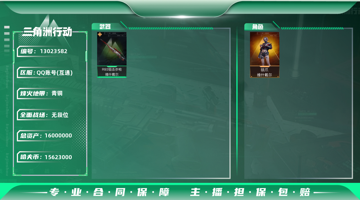 - [11687108]总资产:144.8M 1传说枪械 哈夫币:78.079K 进阶安全箱(9.17到期) 可二次 可修改实名 烽火地带段位:铂金 全面战场段位:无段位 传说武器皮肤:M4A1突击步枪-阿米娅 史诗武器皮肤:M16A4突击步枪-竞赛选手,SV-98狙击步枪-林中猎手
