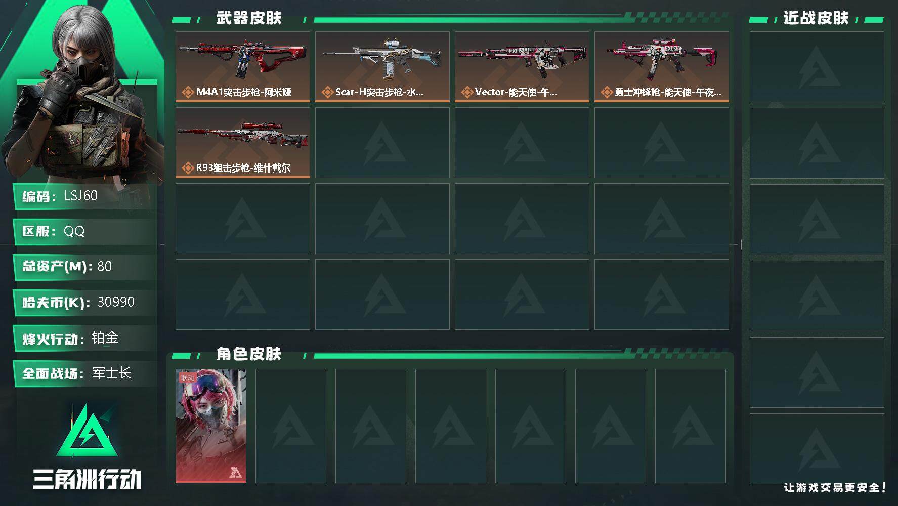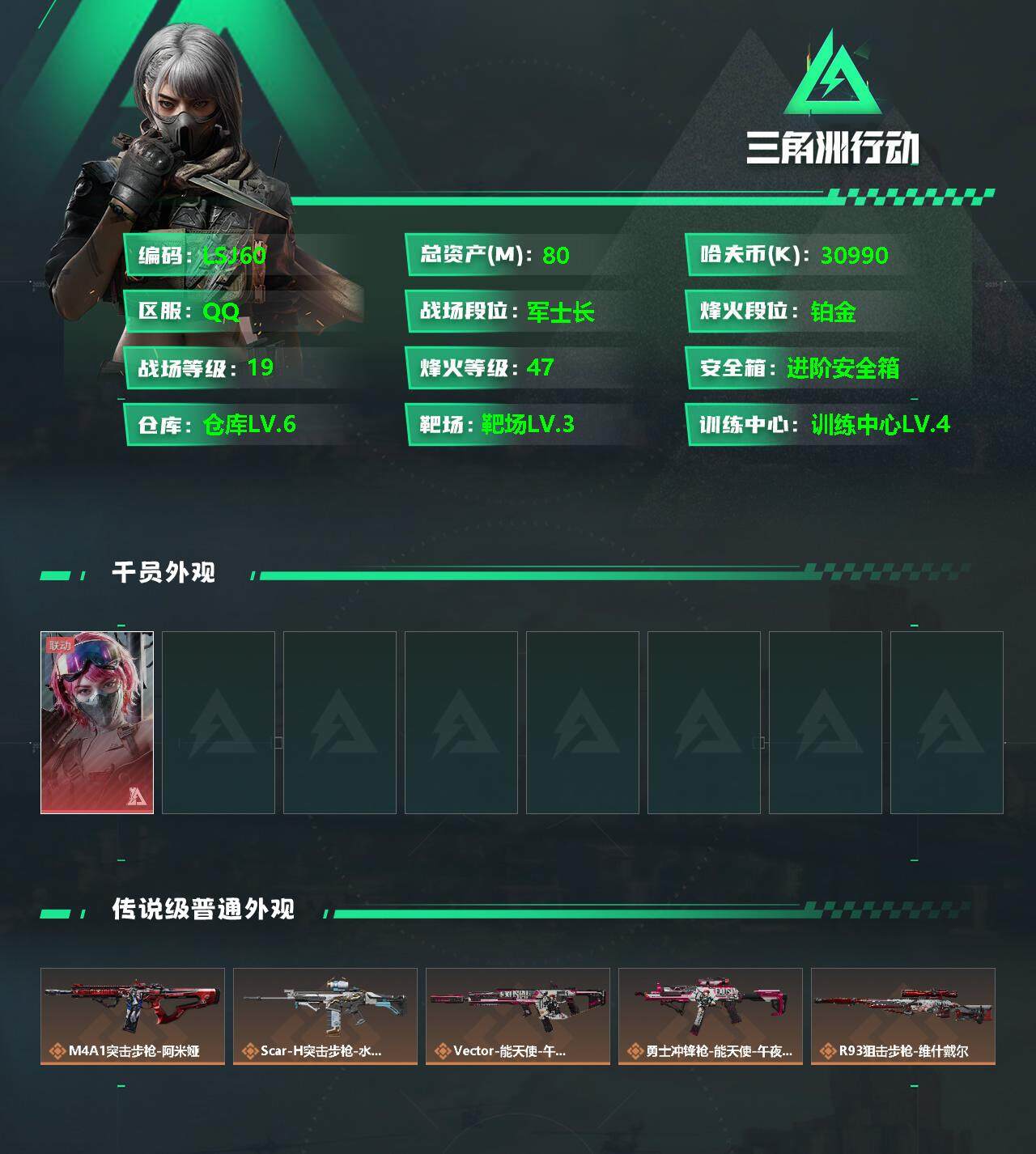 [13023728]总资产80m哈弗币30990流动资产74m 【干员外观】:蛊-能天使午夜邮差 【传说级普通外观】:M4A1突击步枪-阿米娅,R93狙击步枪-维什戴尔,勇士冲锋枪-能天使-午夜邮差,Vector冲锋枪-能天使-午夜邮差,SCAR-H战斗步枪-水墨云图