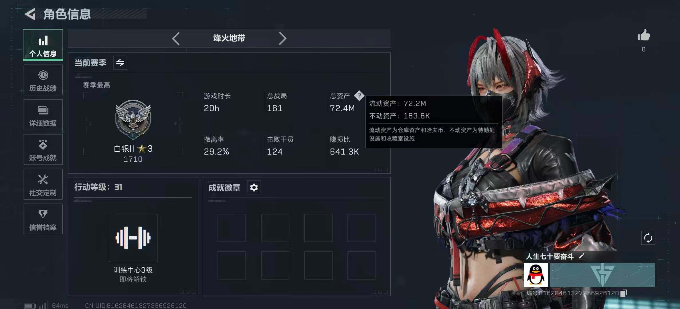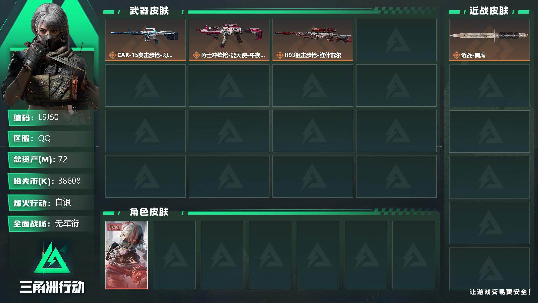 [13023889]总资产72m/流动资产72m 哈弗币38608干员外观】:骇爪-维什戴尔 【传说级普通外观】:CAR-15突击步枪-阿米娅,勇士冲锋枪-能天使-午夜邮差,R93狙击步枪-维什戴尔 【近战皮肤】:近战-黑鹰