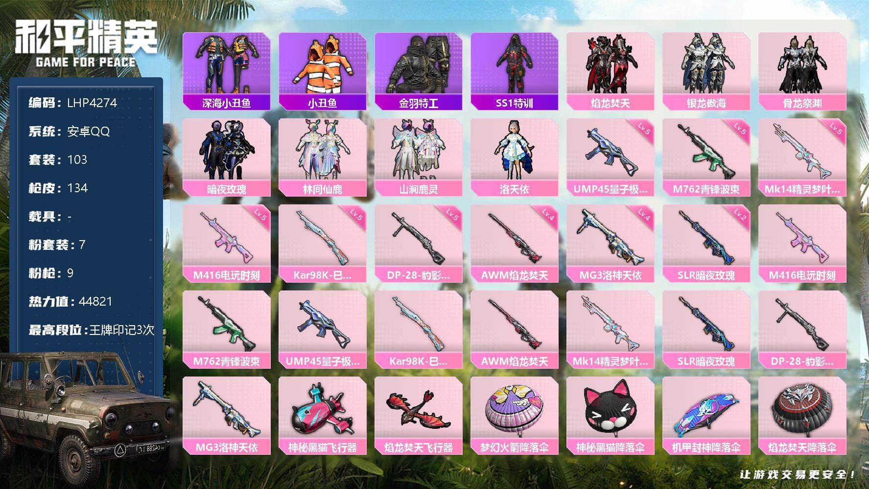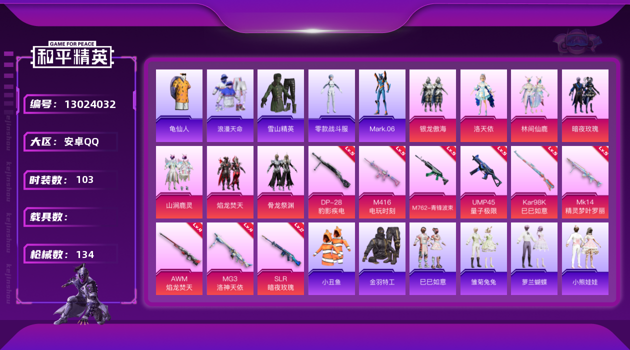 [13024032]地铁满天赋【暑期末清货/特价急出/永久包赔】:安卓 手Q-7粉装-9特效枪-4.4w热力值-3印记-103套装-134枪皮【热门品类】:套装-深海小丑鱼,套装-小丑鱼,套装-金羽特工,套装-SS1特训【特效枪等级】:M416-电玩时刻(五级),M762-青锋波束(五级),UMP45-量子极限(五级),Kar98K-巳巳如意(五级),AWM-焰龙焚天(四级),Mk14-精灵梦叶罗丽(五级),SLR-暗夜玫瑰(二级),DP-28-豹影疾电(五级),MG3-洛神天依(四级)【优质套装】:粉装-焰龙焚天,粉装-银龙傲海,粉装-骨龙祭渊,粉装-暗夜玫瑰,粉装-林间仙鹿,粉装-山涧鹿灵,角色-洛天依【优质飞行器】:神秘黑猫飞行器,焰龙焚天飞行器