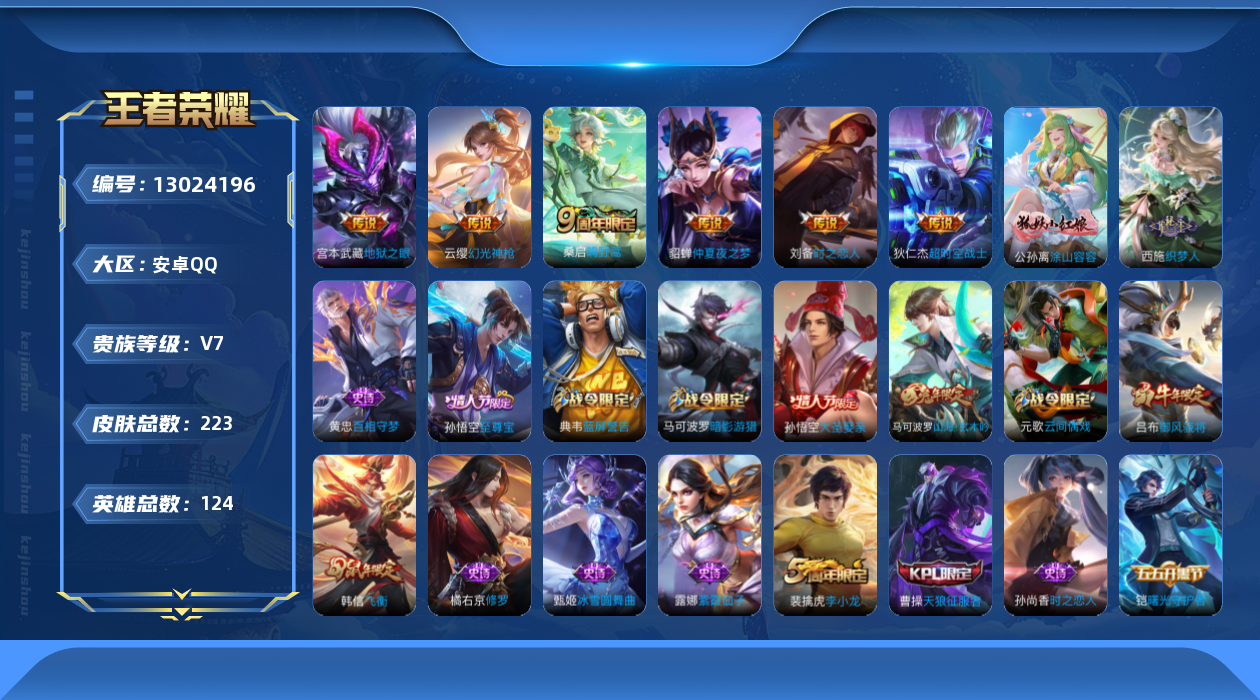 [13024196]安卓Q-V0-最强王者段位-124英雄-223皮肤-0典藏-0珍品无双-0无双-0珍品传说-6传说-58史诗