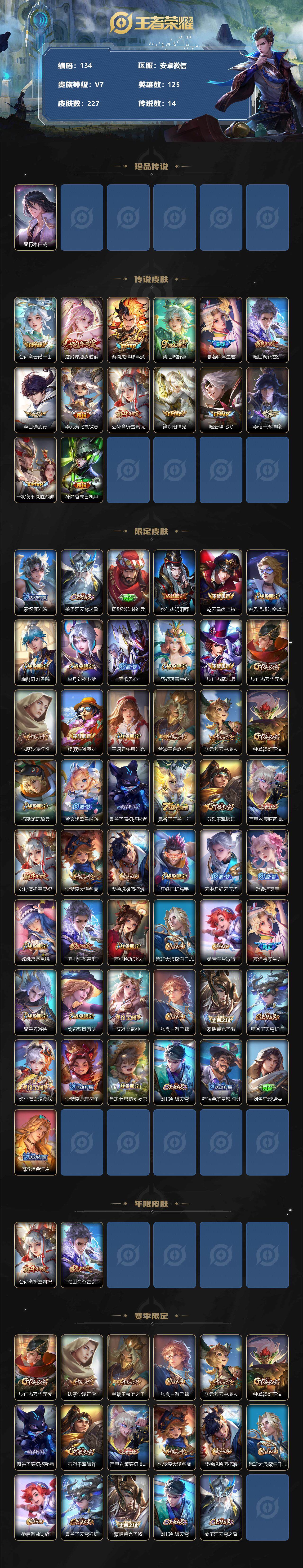 - [11516114]V8 1典藏 6传说 123英雄 277皮肤 可修改实名 优质装备:鸣剑·曳影,黄金射手座,猫影幻舞,地狱火 珍宝阁皮:蔷薇恋人,女武神 限定皮:鸣野蒿,至尊宝,凤求凰(白切鸡),凤凰于飞,飞衡(韩信年限),高山流水,五谷丰年,青龙志(铠年限),梁祝,岱宗(典韦年限),李小龙,玄武志(苏烈年限),辉光之辰 史诗皮:龙之律动,蔬乡物语(鲁班七号),琥珀纪元伽罗,紫霞仙子,苍穹之光,白龙吟,特工魅影,千年之狐,永昼,电玩·爆裂旋风,真我赫兹(百里守约),匿光侦查者,江河有灵,雪夜绮愿(周瑜),百解令(蒙犽),高渐离燃音魔法,龙骑士(小龙虾),暗夜猫娘,无限星赏官,猫狗日记-孙策,时之恋人-孙尚香,乱世虎臣,节奏热浪,女仆咖啡,水果甜心,绅士熊喵,星夜王子,心灵骇客,功夫厨神,德古拉伯爵,暗隐猎兽者,幽灵船长,鬼剑武藏,心灵战警,舞动绿茵,地狱岩魂,纤云弄巧,繁星吟游(呼啦呼啦),拒霜思,缤纷独角兽,乘风破浪,逐浪之夏,月团寄思,水晶猎龙者,曙光守护者,唤灵魅影,金属风暴,圣诞狂欢,圣诞恋歌,鹰眼统帅,魅力维加斯,未来纪元-赵云,玫瑰异探