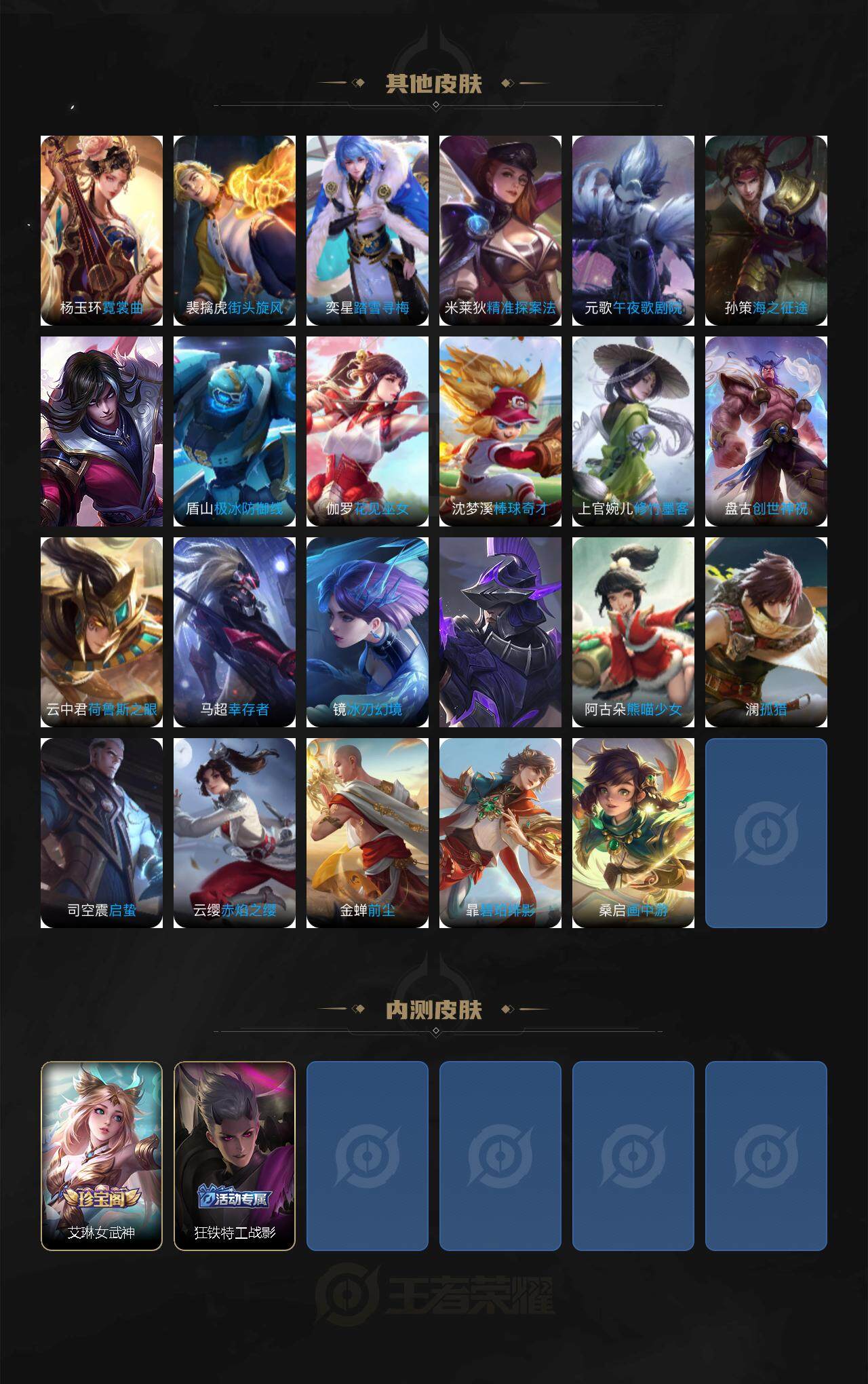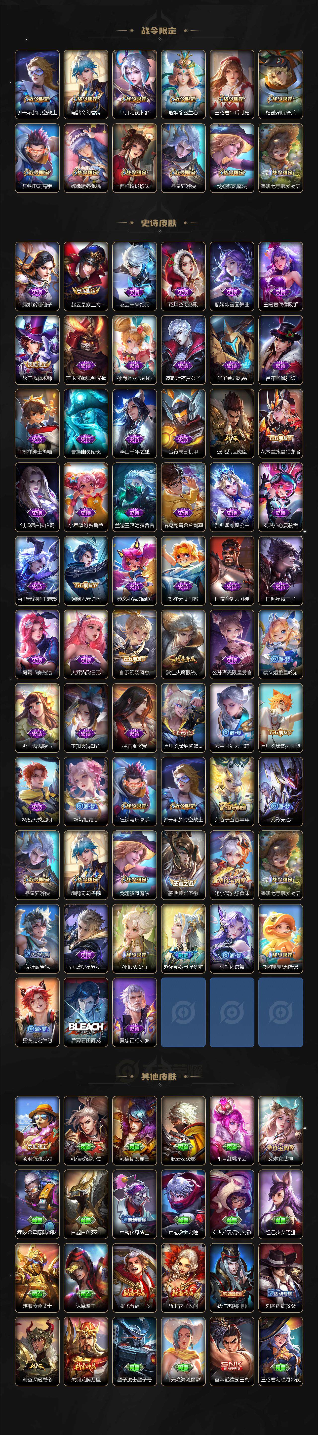 【限定皮肤】:蒙犽顽岩魄,姜子牙天穹之誓,杨戬破阵退雄兵,狄仁杰阴阳师,赵云皇家上将,钟无艳超时空战士,扁鹊奇幻香踪,芈月幻夜卜梦,元歌无心,甄姬落雪兰心,狄仁杰魔术师,狄仁杰万华元夜,达摩沙漠行僧,项羽海滩派对,王昭君午后时光,兰陵王金庭之子,李元芳云中旅人,钟馗驱傩正仪,杨戬潮玩骑兵,蔡文姬繁星吟游,鬼谷子原初探秘者,鬼谷子五谷丰年,苏烈千军破阵,百里玄策原初追逐者,公孙离祈雪灵祝,沈梦溪大漠名商,裴擒虎擒涛扼浪,狂铁电玩高手,云中君纤云弄巧,嫦娥拒霜思,嫦娥暖冬兔眠,曜山海苍雷引,西施玲珑珍味,鲁班大师探海日志,桑启海盐诗旅,夏洛特浮生妄,暃星界游侠,戈娅驭风魔法,艾琳女武神,张良古海寻踪,蒙恬荣光圣徽,鬼谷子天穹祈灯,姬小满妄想食味,沈梦溪龙舞盛年,鲁班七号蔬乡物语,刘邦剑破天穹,程咬金群星魔术团,刘备异域游侠,周瑜熔金海岸