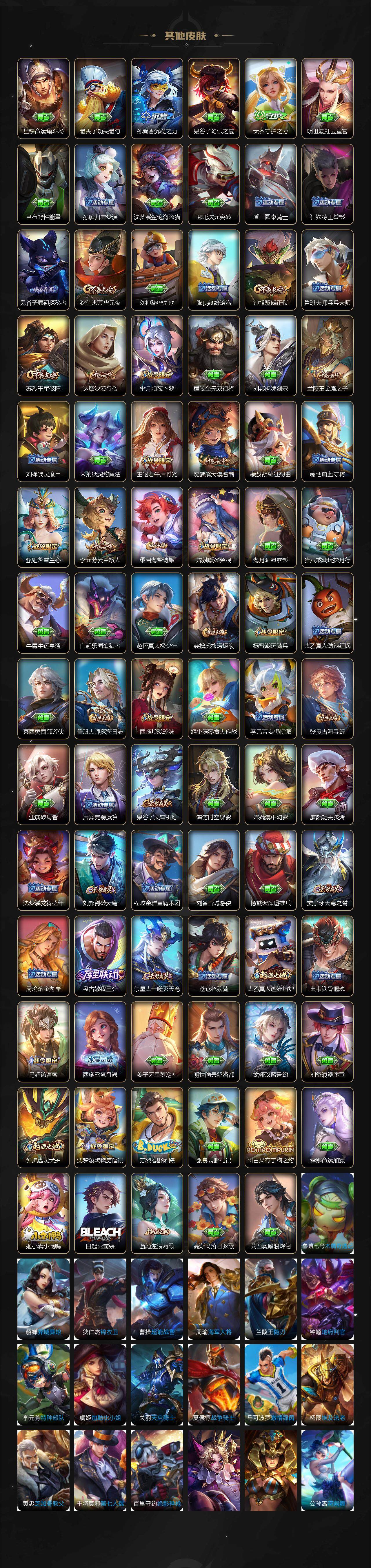 【赛季限定】:狄仁杰万华元夜,达摩沙漠行僧,兰陵王金庭之子,张良古海寻踪,李元芳云中旅人,钟馗驱傩正仪,鬼谷子原初探秘者,苏烈千军破阵,百里玄策原初追逐者,沈梦溪大漠名商,裴擒虎擒涛扼浪,鲁班大师探海日志,桑启海盐诗旅,鬼谷子天穹祈灯,蒙恬荣光圣徽,刘邦剑破天穹,姜子牙天穹之誓