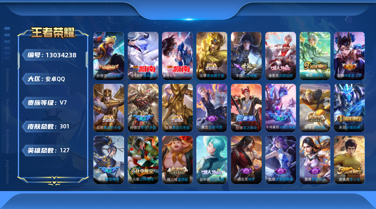 [13034238]安卓Q-V7-永恒钻石V段位-126英雄-300皮肤-1典藏-0珍品无双-0无双-2珍品传说-8传说-70史诗 【荣耀典藏】:孙悟空全息碎影 【珍品传说】:马可波罗怪盗基德,鲁班七号江户川柯南 【传说皮肤】:桑启鸣野蒿,孙悟空零号赤焰,李信一念神魔,张良黄金白羊座,达摩黄金狮子座,后羿黄金射手座,诸葛亮武陵仙君,貂蝉仲夏夜之梦 【限定皮肤】:姜子牙天穹之誓,狄仁杰阴阳师,赵云皇家上将,嬴政白昼王子,孙尚香蔷薇恋人,庄周高山流水,高渐离玩趣恶龙,芈月重明,芈月幻夜卜梦,吕布猎兽之王,元歌云间偶戏,夏侯惇朔风刀,甄姬游园惊梦,曹操烛龙,典韦穷奇,狄仁杰魔术师,狄仁杰万华元夜,达摩星际陆战队,达摩沙漠行僧,项羽海滩派对,老夫子醍醐杖,关羽冰锋战神,程咬金演武夺筹,韩信傲雪梅枪,兰陵王金庭之子,亚瑟潮玩骑士王,孙悟空零号赤焰,孙悟空孙行者,牛魔御旌,牛魔奔雷神使,后羿圣弓游侠,李元芳银河之约,李元芳云中旅人,虞姬霸王别姬,钟馗驱傩正仪,杨玉环遇见飞天,干将莫邪冰霜恋舞曲,干将莫邪胡桃夹子,干将莫邪真爱魔法,雅典娜单词大作战,蔡文姬繁星吟游,东皇太一逐梦之光,鬼谷子原初探秘者,鬼谷子五谷丰年,诸葛亮武陵仙君,黄忠火炮绅士,苏烈千军破阵,弈星混沌棋,梦奇顽趣,沈梦溪星空之诺,沈梦溪大漠名商,明世隐疑决卦,裴擒虎李小龙,裴擒虎擒涛扼浪,狂铁御狮,米莱狄御霄,米莱狄胡桃异想国,云中君时之祈愿,盾山御銮,猪八戒猪悟能,嫦娥拒霜思,蒙犽狂想玩偶喵,鲁班大师探海日志,桑启海盐诗旅,阿古朵江河有灵,张良古海寻踪,鬼谷子天穹祈灯,沈梦溪龙舞盛年,刘邦剑破天穹,程咬金群星魔术团,周瑜熔金海岸 【年限皮肤】:牛魔奔雷神使 【赛季限定】:芈月重明,夏侯惇朔风刀,曹操烛龙,典韦穷奇,狄仁杰万华元夜,达摩沙漠行僧,老夫子醍醐杖,程咬金演武夺筹,兰陵王金庭之子,张良古海寻踪,牛魔御旌,李元芳云中旅人,钟馗驱傩正仪,鬼谷子原初探秘者,苏烈千军破阵,弈星混沌棋,梦奇顽趣,沈梦溪大漠名商,明世隐疑决卦,裴擒虎擒涛扼浪,狂铁御狮,米莱狄御霄,盾山御銮,鲁班大师探海日志,桑启海盐诗旅,鬼谷子天穹祈灯,刘邦剑破天穹,姜子牙天穹之誓 【战令限定】:嬴政白昼王子,芈月幻夜卜梦,吕布猎兽之王,元歌云间偶戏,达摩星际陆战队,亚瑟潮玩骑士王,后羿圣弓游侠,李元芳银河之约,干将莫邪真爱魔法,雅典娜单词大作战,黄忠火炮绅士,沈