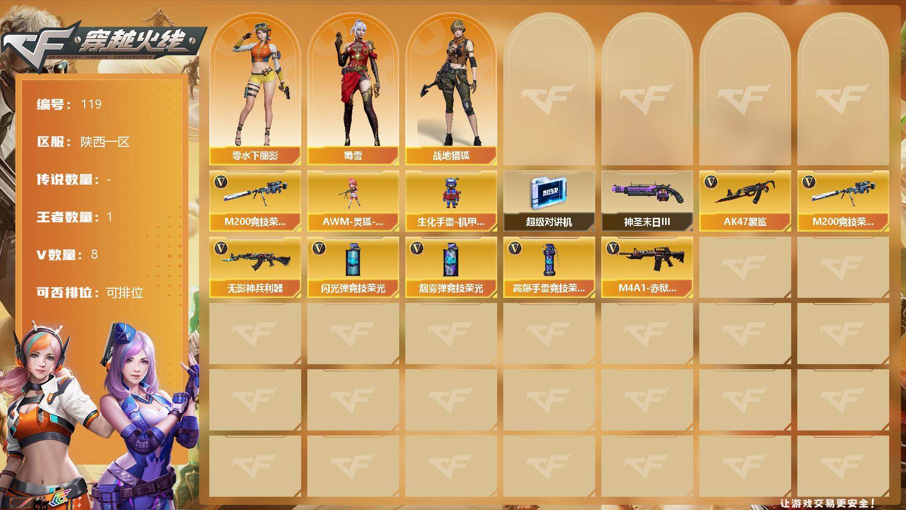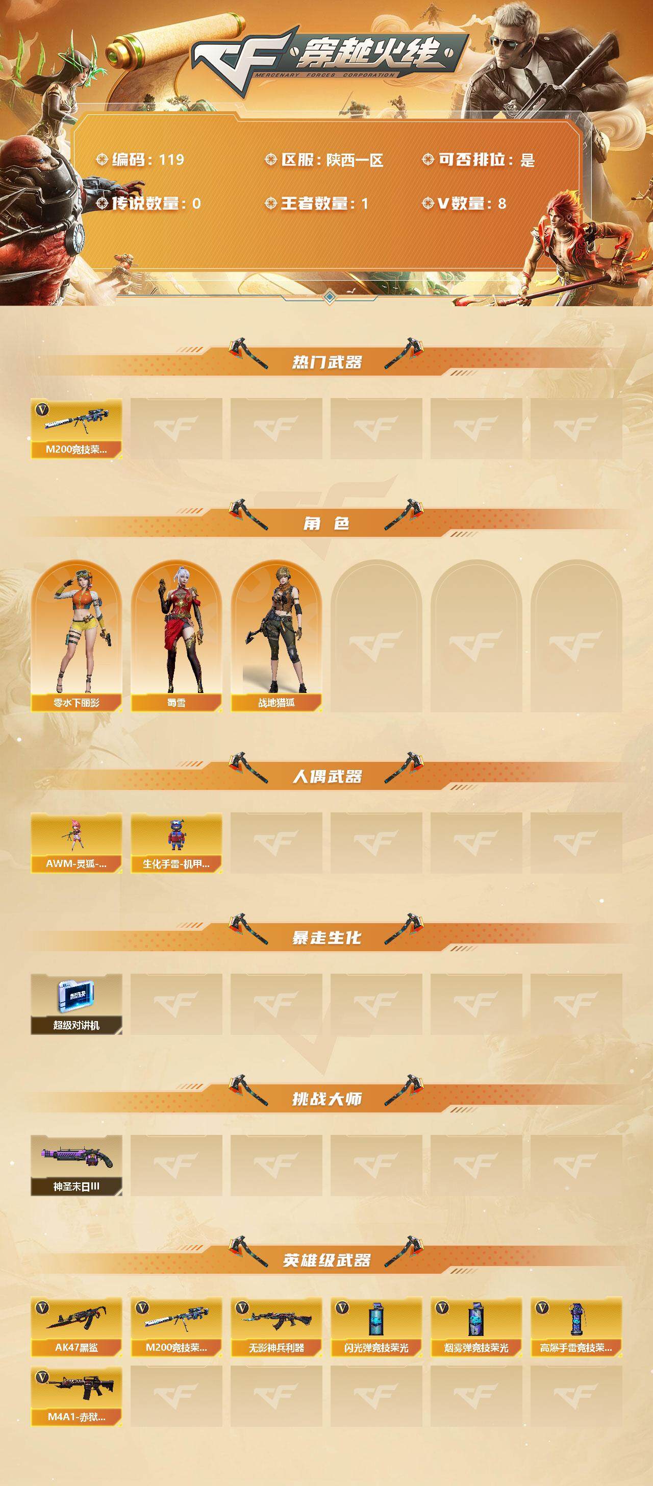- [9542264]【商品标题】:陕西一区-33V-3王者-0炫金 【热门武器】:QBZ03-金色蔷薇,M200-幻神*2,M200-竞技荣光,M4A1-黑骑士*2,沙鹰-修罗*3 【稀有皮肤】:雷神-荣耀之魄,雷神-冠军之魄,黑骑士-CFS2021,M200-庆典-CFS 2021,AWM-CFS 2020,屠龙-荣耀之锋 【角色】:电竞教官-云悠悠,铁骑荣耀,战地猎狐 【人偶武器】:AWM-灵狐-15周年嘉年华,迷你巨石泰坦-魔花研究所,迷你波特博士*3,灵狐娃娃手雷,生化手雷-机甲核心*2,深渊终结者手雷 【暴走生化】:超级对讲机 【挑战大师】:神圣爆裂者-末日III,试炼破坏者III,激光毁灭者III-白马银枪 【英雄级武器】:M200-竞技荣光,柯尔特-竞技荣光,擎天-竞技荣光,高爆手雷-竞技荣光*2,烟雾弹-竞技荣光*3,闪光弹-竞技荣光*3,QBZ03-金色蔷薇,无影-神兵利器,M4A1-雷神,M4A1-黑骑士*2,AK47-火麒麟,AWM-裁决,M200-幻神*2,黑武士-锦绣游龙,黑骑士-海王,死神-雪域霜狐,AWM-昌龙,沙鹰-天神*2,沙鹰-修罗*3,屠龙*2 【特殊枪械】:0白虎,2黑骑士,0烈龙,0盘龙,0炼狱,0蝴蝶斯泰尔