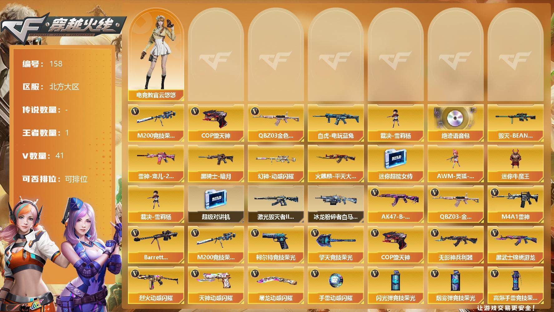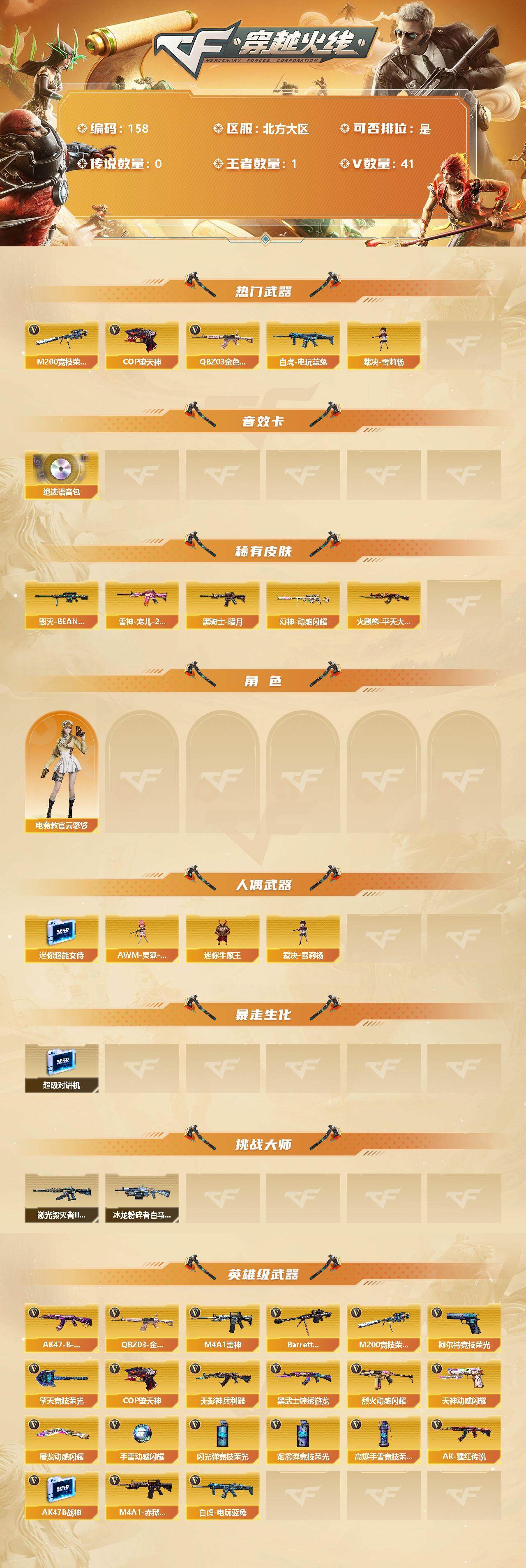 [13034578]【158】40V/92级/将帅/1王者/1英雄/QBZ03-金色蔷薇/M200-竞技荣光/白虎-电玩蓝兔/裁决-雪莉杨/COP-堕天神/绝迹语音包/幻神动感闪耀/雷神-宠儿-2019MVP/火麒麟-平天大圣/黑骑士-暗月/毁灭-BEAN-2020MVP/电竞教官-云悠悠/AWM-灵狐-15周年嘉年华/迷你超能女侍/迷你牛魔王/超级对讲机/激光毁灭者III-白马银枪/冰龙粉碎者-白马银枪/柯尔特-竞技荣光/擎天-竞技荣光/高爆手雷-竞技荣光/烟雾弹-竞技荣光/闪光弹-竞技荣光/烈火-动感闪耀/天神-动感闪耀/屠龙-动感闪耀/手雷-动感闪耀/无影-神兵利器/M4A1-雷神/Barrett-毁灭/AK47-黑武士-锦绣游龙/AK-47-猩红传说/AK47-B-战神/AK47-B-常胜将军/M4A1-赤狱骑士