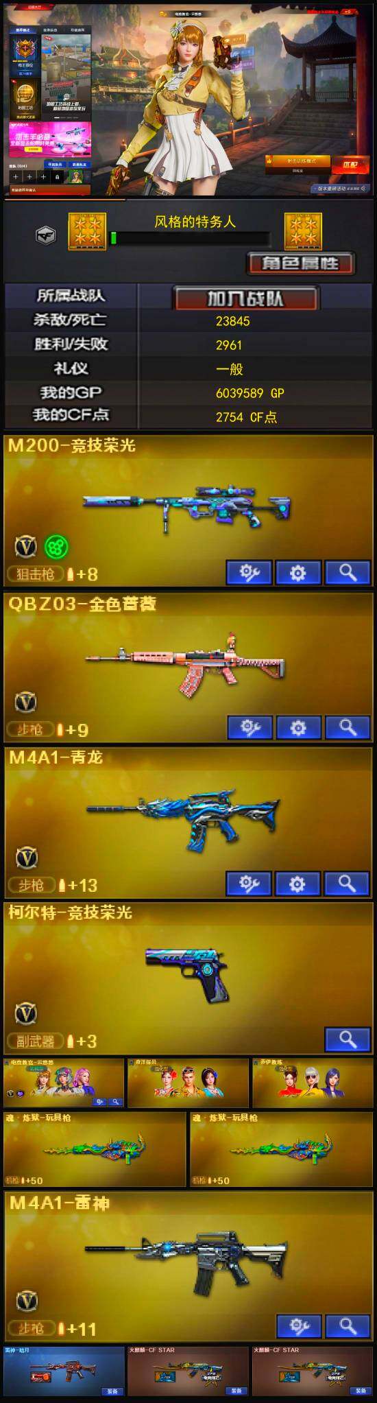 - [13953798]陕西一区-53V-1王者-0炫金 【热门武器】:QBZ03-金色蔷薇,死亡之眼,汤姆逊-烈龙*6,RPK-盘龙*6,加特林-炼狱,沙鹰-修罗*3 【王者炫金武器】:王者之势 【音效卡】:Barrett-毁灭音效卡 【皮肤】:雷神-暗月,雷神-荣耀之魄,雷神-星空,毁灭-荣耀之怒,毁灭耀金皮肤*2,黑龙-暗月,战神-粉色甜心皮肤*2,战神-紫绶金章皮肤*4,战神-流金岁月皮肤,修罗耀金皮肤 【角色】:潘多拉-X,潜龙队-X 【人偶武器】:COP-旗袍,闪光弹-小乔 【暴走生化】:死亡之眼 【英雄级武器】:M4A1-千变*3,AK47-火麒麟*2,M4A1-黑龙,M4A1-雷神*2,AK12-天启,M4A1-玫瑰精灵,QBZ03-金色蔷薇,AK-47-猩红传说*5,AK47-B-战神,AWM-天龙*2,Barrett-毁灭*3,Barrett-极光*4,RPK-盘龙*6,加特林-炼狱,汤姆逊-烈龙*6,沙鹰-修罗*3,沙鹰-天神*3,屠龙*2,龙啸,擎天,麒麟刺 【道具】:战舰背包,炫彩背包,超级背包,变异宝贝,夺命之镰,防化服,枪王排位29赛季金色流光,防弹头盔*3,防弹衣*3,C4工具钳,手雷包*2 【特殊枪械】:6烈龙,6盘龙,1炼狱