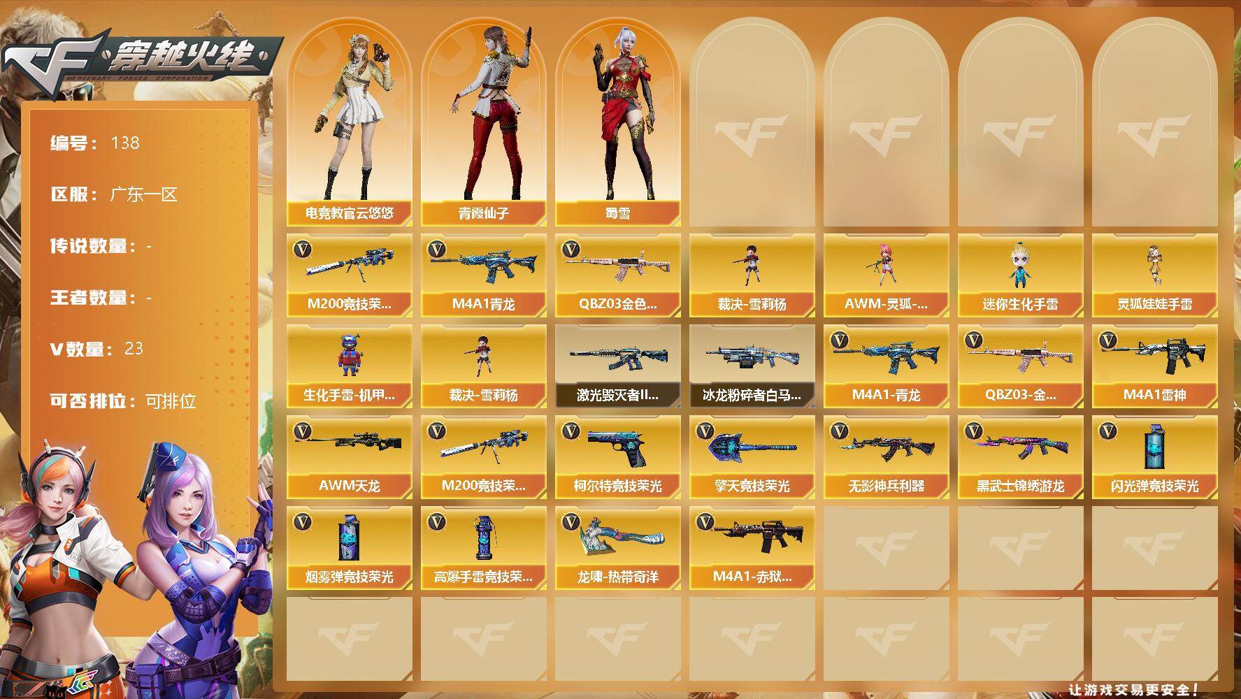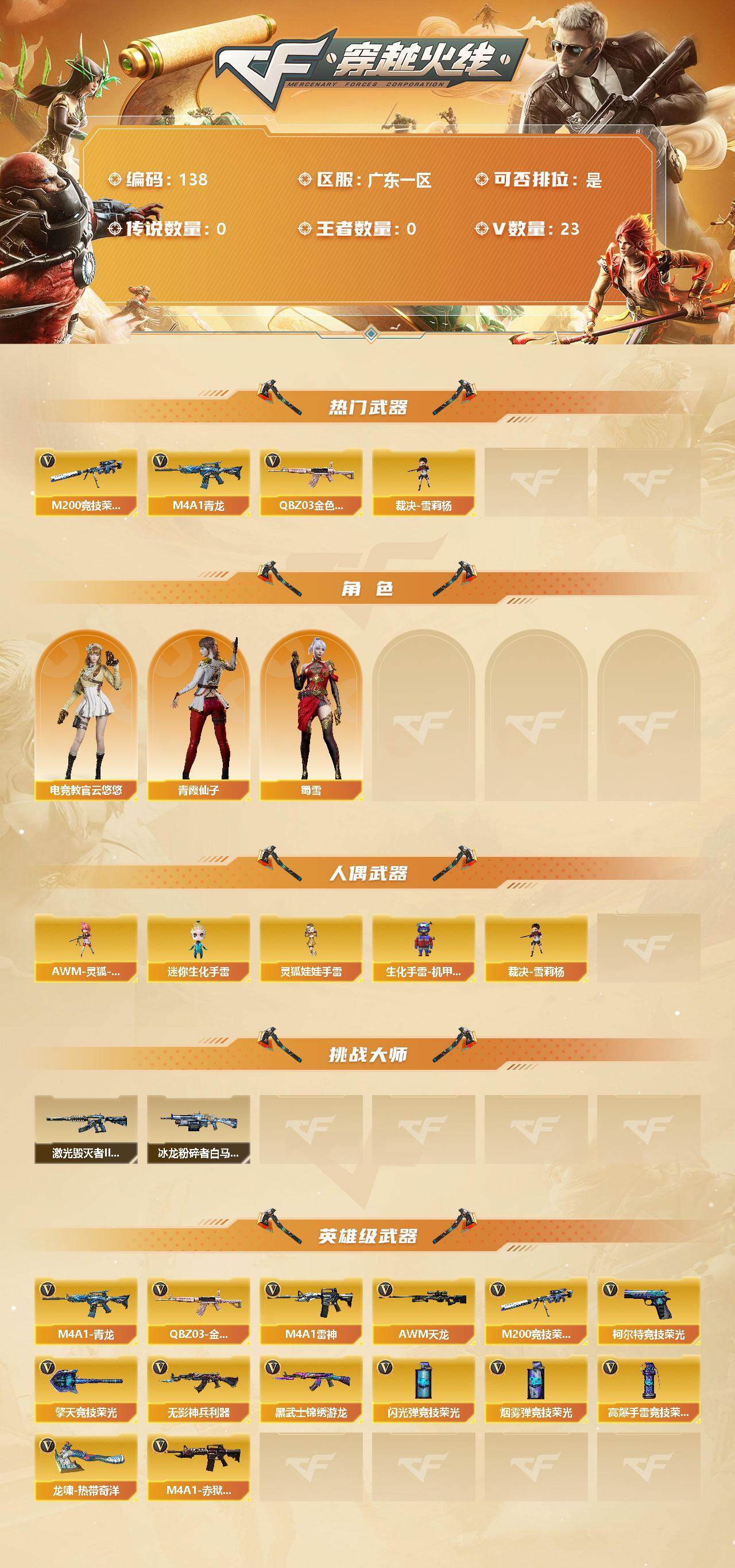 [13034545]【138】22V/94级/将帅/1英雄/QBZ03-金色蔷薇/M4A1青龙/M200-竞技荣光/裁决-雪莉杨/电竞教官-云悠悠/蜀雪/青霞仙子/AWM-灵狐-15周年嘉年华/迷你生化手雷/灵狐娃娃手雷/生化手雷-机甲核心/激光毁灭者III-白马银枪/冰龙粉碎者-白马银枪/柯尔特-竞技荣光/擎天-竞技荣光/高爆手雷-竞技荣光/烟雾弹-竞技荣光/闪光弹-竞技荣光/无影-神兵利器/M4A1-雷神/AWM-天龙/AK47-黑武士-锦绣游龙/M4A1-赤狱骑士/龙啸-热带奇洋