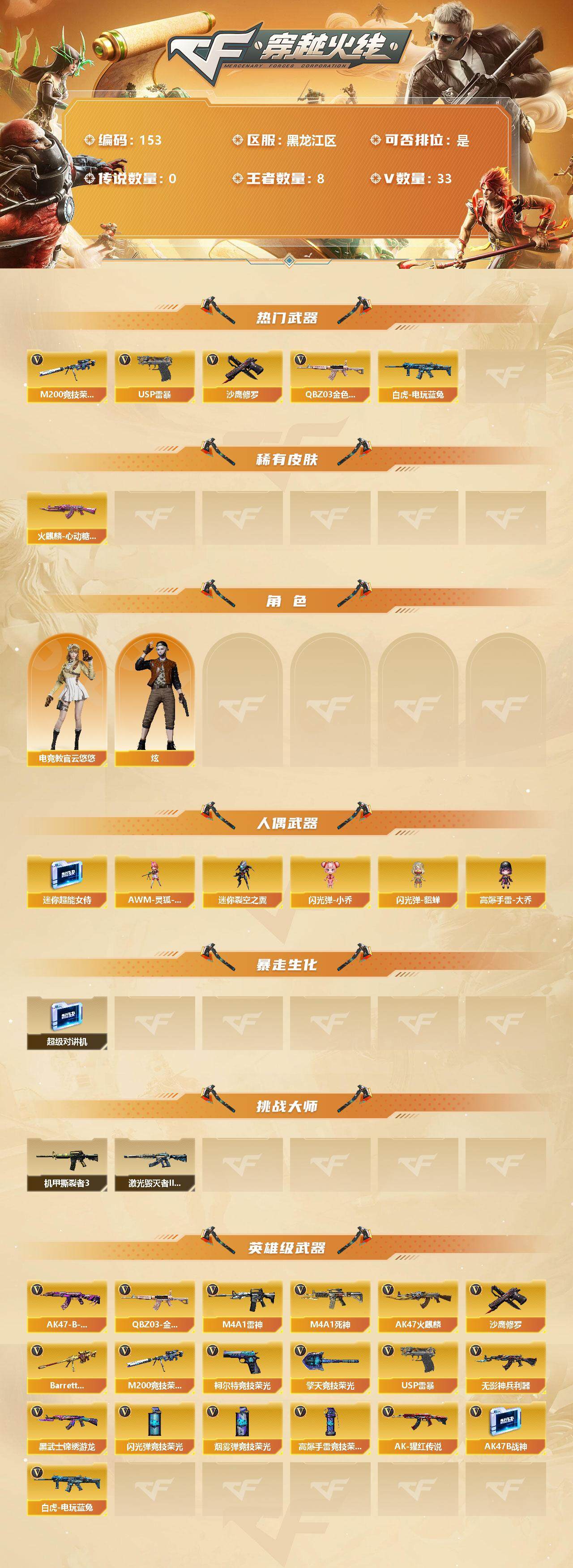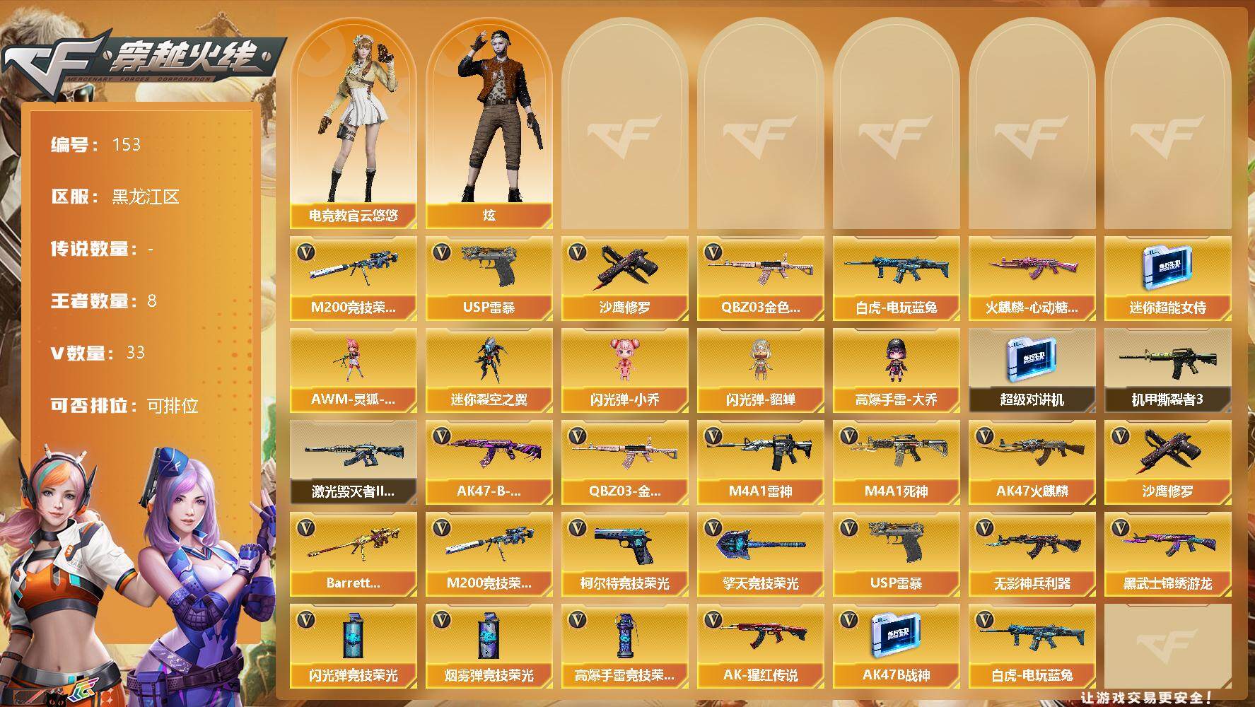 [13034720]【153】31V/100级/元帅/8王者/2英雄/QBZ03-金色蔷薇/M200-竞技荣光/白虎-电玩蓝兔/USP雷暴/沙鹰-修罗/火麒麟-心动糖果/炫/电竞教官-云悠悠/AWM-灵狐-15周年嘉年华/迷你超能女侍/迷你裂空之翼/闪光弹-小乔/闪光弹-貂蝉/高爆手雷-大乔/超级对讲机/机甲撕裂者/激光毁灭者III-白马银枪/柯尔特-竞技荣光/擎天-竞技荣光/高爆手雷-竞技荣光/烟雾弹-竞技荣光/闪光弹-竞技荣光/无影-神兵利器/M4A1-雷神/M4A1-死神/AK47-火麒麟/Barrett-朱雀/AK47-黑武士-锦绣游龙/AK-47-猩红传说/AK47-B-战神/AK47-B-常胜将军
