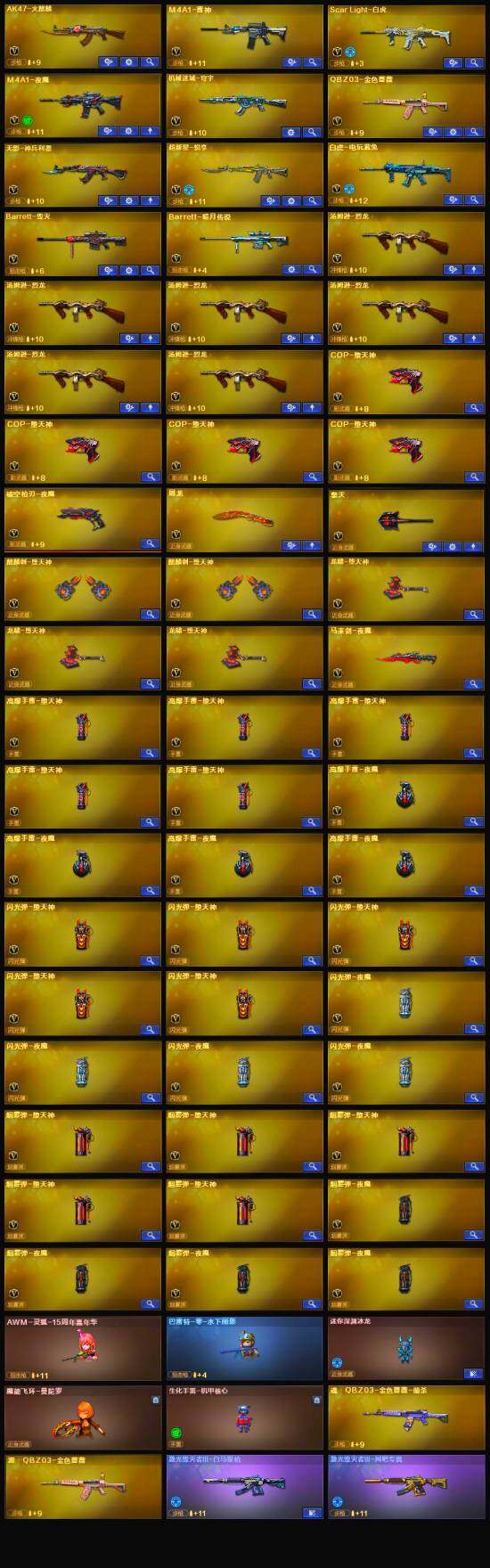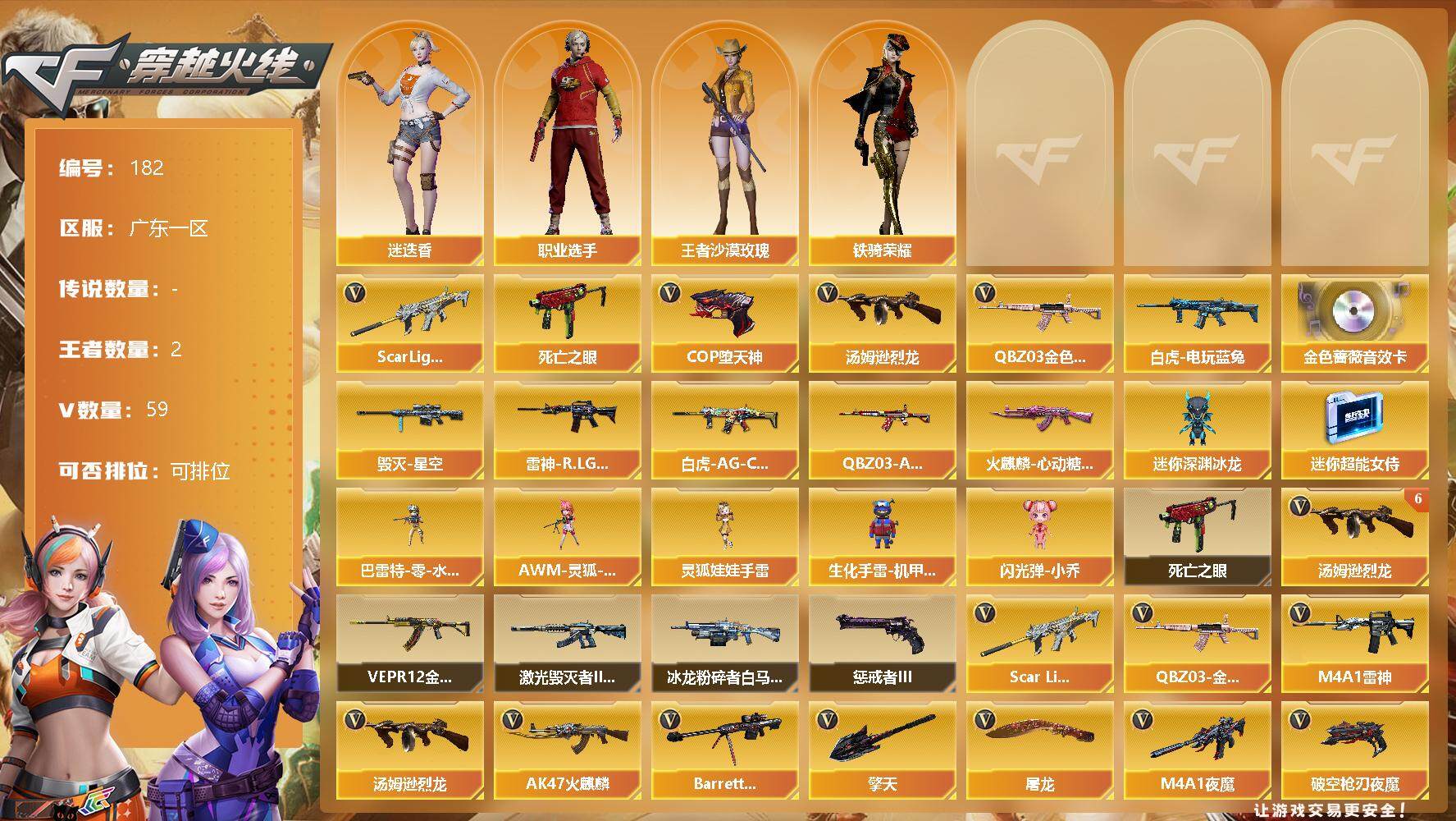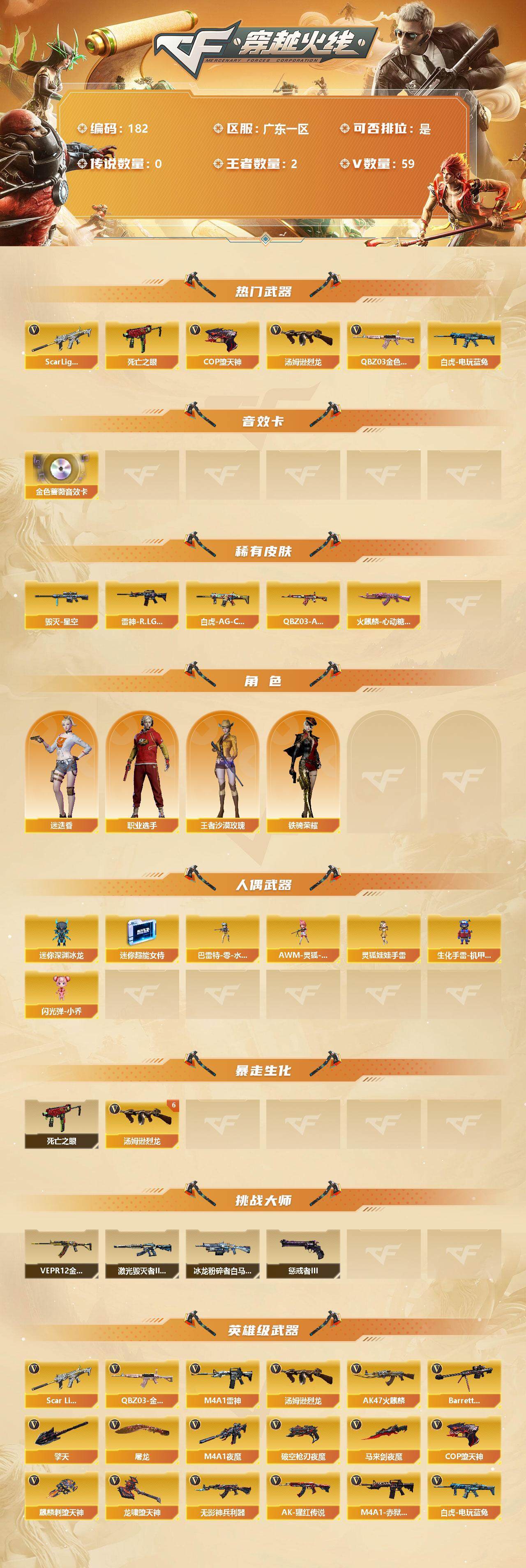 [13034719]【182】58V/102级/荣耀元首/2王者/1英雄/QBZ03-金色蔷薇/Scar Light-白虎/死亡之眼/白虎-电玩蓝兔/汤姆逊-烈龙/COP-堕天神/金色蔷薇音效卡/白虎-AG-CFPLS20冠军/QBZ03-AG-CFPLS19冠军/雷神-R.LGD-CFPLS18冠军/火麒麟-心动糖果/毁灭-星空/王者-沙漠玫瑰/迷迭香/铁骑荣耀/职业选手/巴雷特-零-水下丽影/AWM-灵狐-15周年嘉年华/迷你深渊冰龙/迷你超能女侍/灵狐娃娃手雷/生化手雷-机甲核心/闪光弹-小乔/6烈龙/惩戒者/VEPR-12-金魔/激光毁灭者III-白马银枪/冰龙粉碎者-白马银枪/M4A1-夜魔/破空枪刃-夜魔/马来剑夜魔/麒麟刺-堕天神/龙啸-堕天神/无影-神兵利器/M4A1-雷神/AK47-火麒麟/Barrett-毁灭/AK-47-猩红传说/M4A1-赤狱骑士/擎天/屠龙