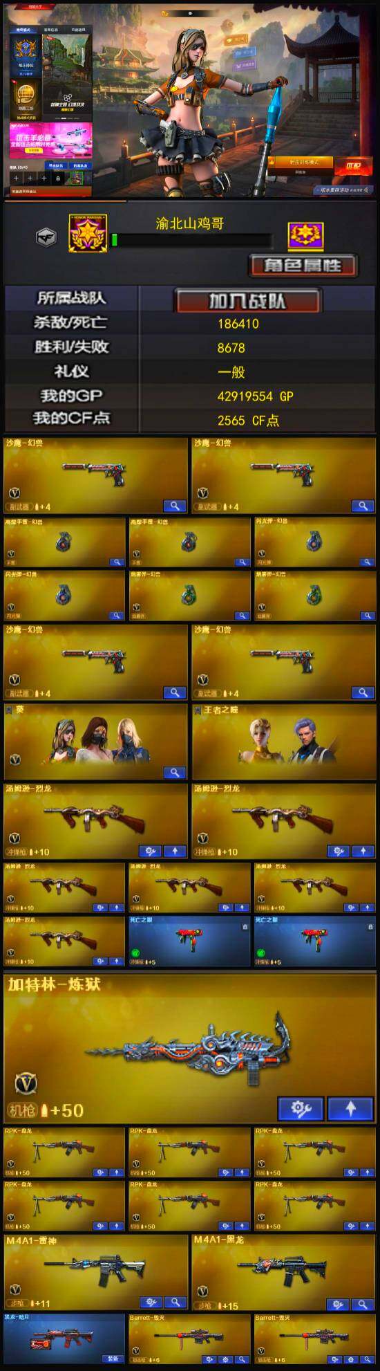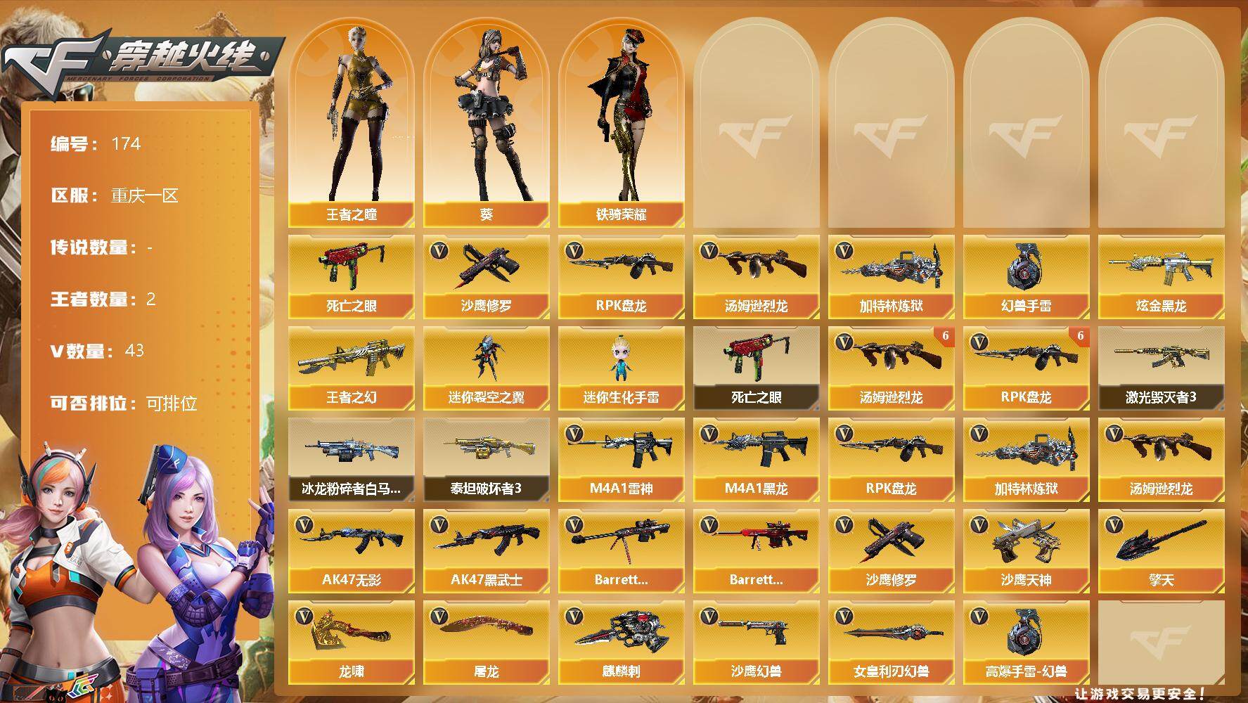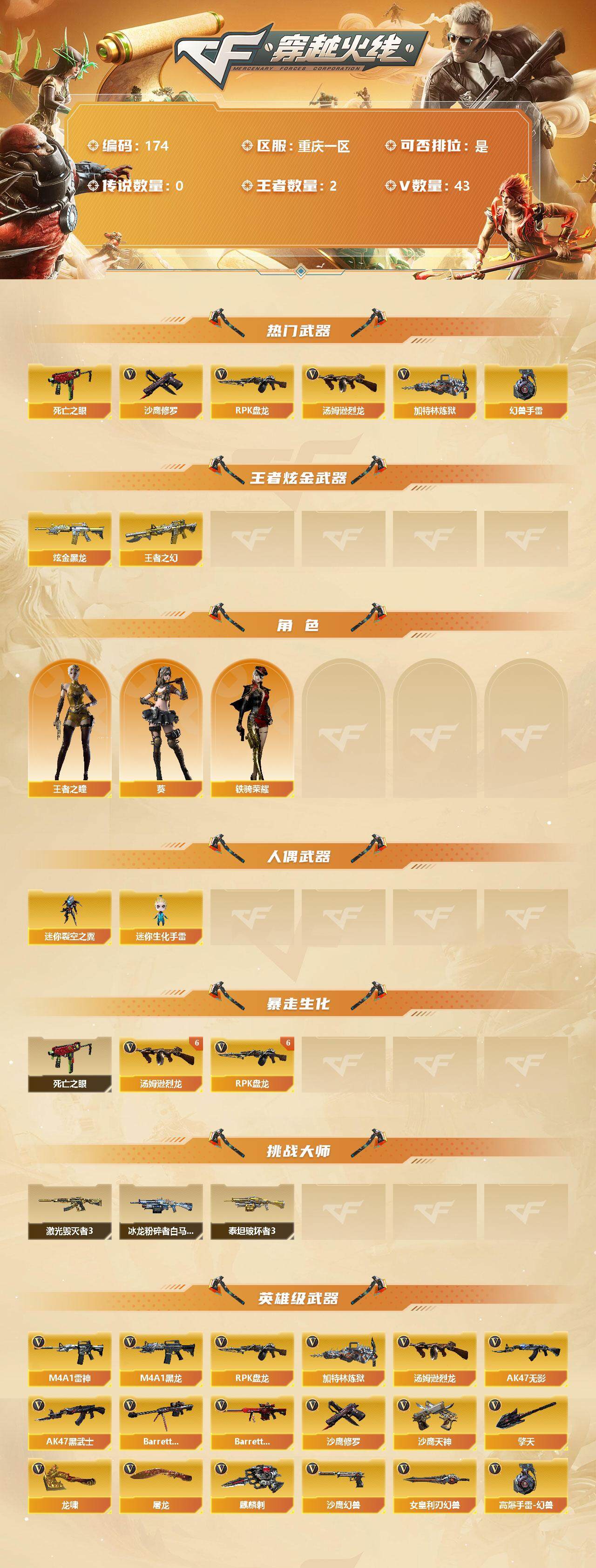 [13034684]【174】42V/102级/荣耀元首/2王者/1炫金/1英雄/死亡之眼/汤姆逊-烈龙/RPK-盘龙/加特林-炼狱/沙鹰-修罗/高爆手雷-幻兽/炫金黑龙/王者之幻/王者之瞳/葵/铁骑荣耀/迷你裂空之翼/迷你生化手雷/6烈龙/6盘龙/激光毁灭者/AK47-泰坦破坏者/冰龙粉碎者-白马银枪/沙鹰-幻兽/女皇利刃-幻兽/M4A1-雷神/M4A1-黑龙/AK47-无影/AK47-黑武士/Barrett-毁灭/Barrett-极光/沙鹰-天神/麒麟刺/擎天/龙啸/屠龙