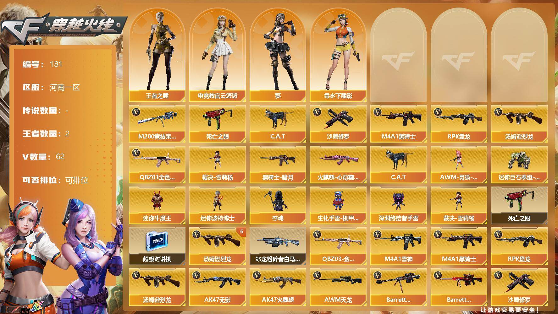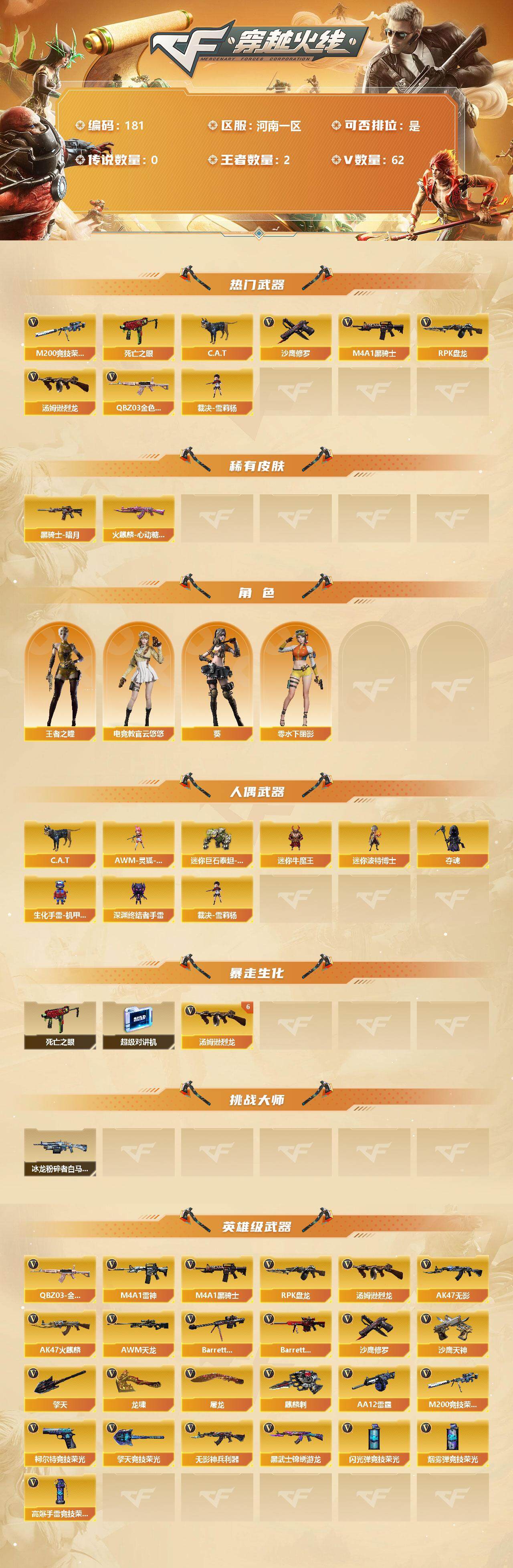 [13034704]【181】60V/100级/元帅/2王者/2英雄/QBZ03-金色蔷薇/M200-竞技荣光/死亡之眼/C.A.T/M4A1-黑骑士/汤姆逊-烈龙/RPK-盘龙/裁决-雪莉杨/沙鹰-修罗/火麒麟-心动糖果/黑骑士-暗月/王者之瞳/零-水下丽影/葵/电竞教官-云悠悠/AWM-灵狐-15周年嘉年华/迷你巨石泰坦-魔花研究所/迷你牛魔王/迷你波特博士/夺魂/生化手雷-机甲核心/深渊终结者手雷/超级对讲机/6烈龙/冰龙粉碎者-白马银枪/柯尔特-竞技荣光/擎天-竞技荣光/高爆手雷-竞技荣光/烟雾弹-竞技荣光/闪光弹-竞技荣光/无影-神兵利器/M4A1-雷神/AK47-无影/AK47-火麒麟/AWM-天龙/Barrett-毁灭/Barrett-极光/AA-12-雷霆/AK47-黑武士-锦绣游龙/沙鹰-天神/麒麟刺/擎天/龙啸/屠龙