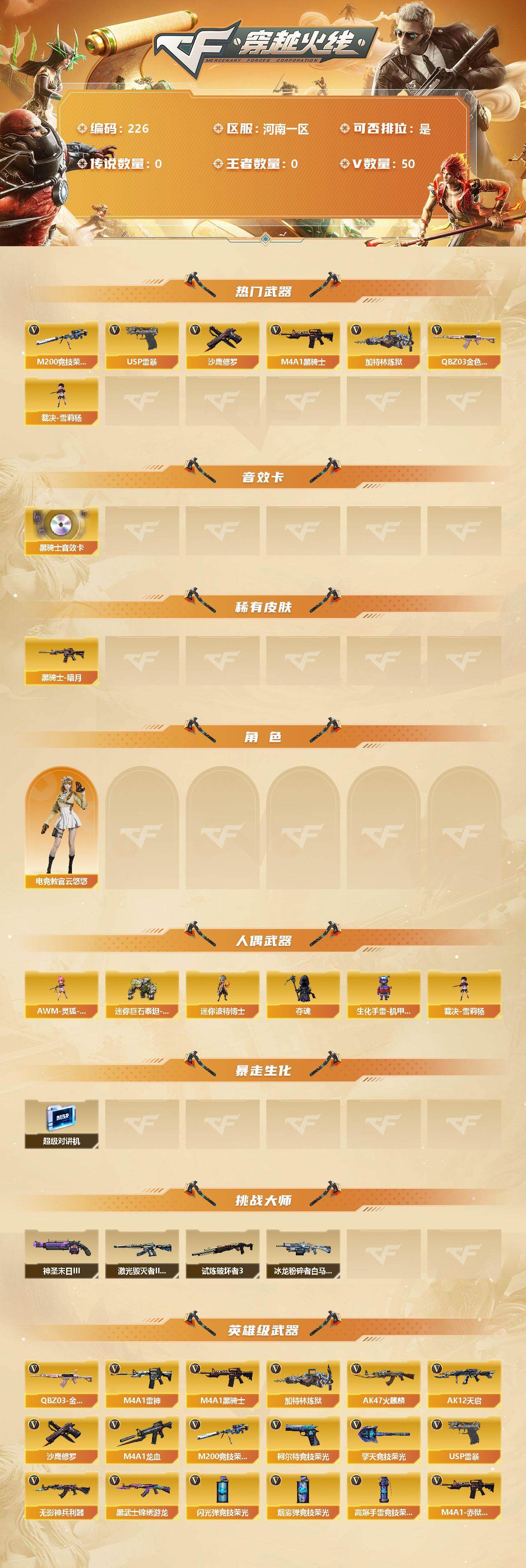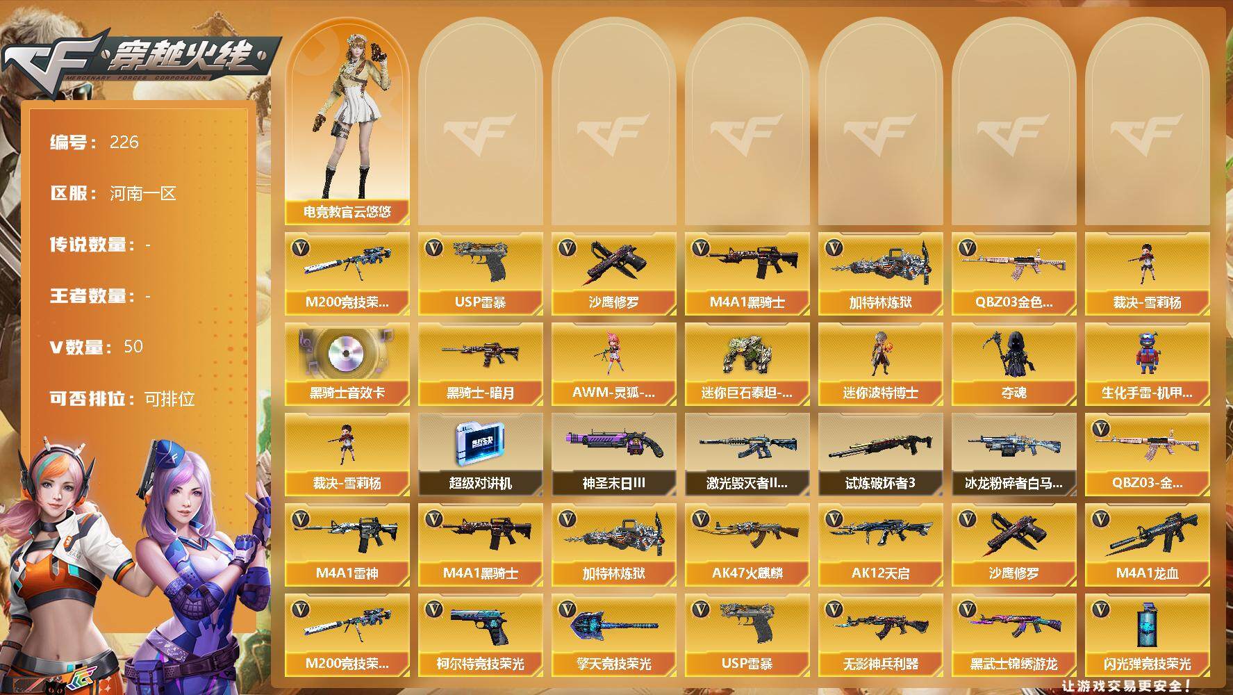 [13035023]【226】49V/100级/元帅/1英雄/QBZ03-金色蔷薇/M200-竞技荣光/M4A1-黑骑士/加特林-炼狱/裁决-雪莉杨/USP雷暴/沙鹰-修罗/M4A1-黑骑士音效卡/黑骑士-暗月/电竞教官-云悠悠/AWM-灵狐-15周年嘉年华/迷你巨石泰坦-魔花研究所/迷你波特博士/夺魂/生化手雷-机甲核心/超级对讲机/神圣爆裂者-末日/试炼破坏者/激光毁灭者III-白马银枪/冰龙粉碎者-白马银枪/柯尔特-竞技荣光/擎天-竞技荣光/高爆手雷-竞技荣光/烟雾弹-竞技荣光/闪光弹-竞技荣光/无影-神兵利器/M4A1-雷神/AK47-火麒麟/AK12-天启/M4A1-龙血/AK47-黑武士-锦绣游龙/M4A1-赤狱骑士