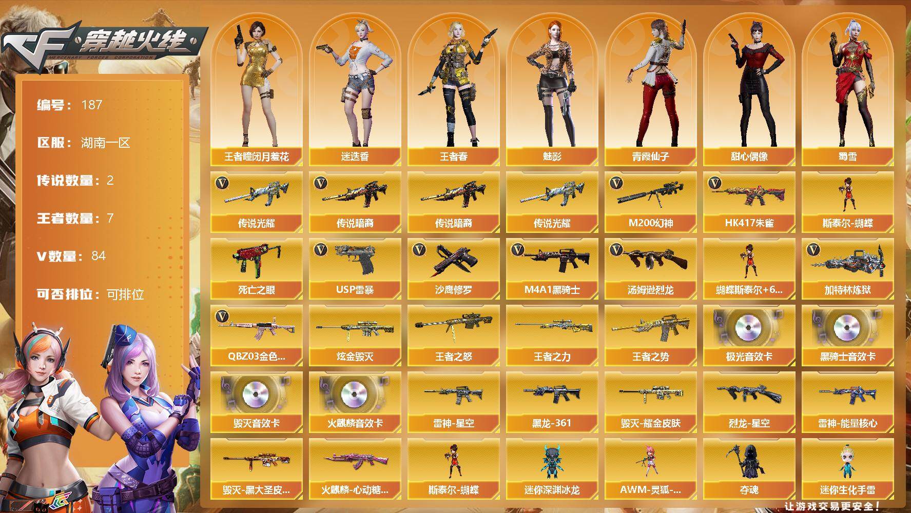 [13034754]【187】82V/102级/荣耀元首/2传说/7王者/1炫金/2英雄/传说光耀/传说暗裔/QBZ03-金色蔷薇/HK417-朱雀/M200-幻神/死亡之眼/M4A1-黑骑士/汤姆逊-烈龙/加特林-炼狱/斯泰尔蝴蝶/USP雷暴/沙鹰-修罗/蝴蝶斯泰尔+6烈龙/炫金毁灭/王者之势/王者之怒/王者之力/AK47-火麒麟音效卡/M4A1-黑骑士音效卡/Barrett-毁灭音效卡/Barrett-极光音效卡/雷神-能量核心/雷神-星空/火麒麟-心动糖果/M4A1-黑龙-361/毁灭耀金皮肤/毁灭-黑大圣皮肤/烈龙-星空/王者-瞳-闭月羞花/王者春/魅影/迷迭香/蜀雪/铁骑荣耀/青霞仙子/甜心偶像/AWM-灵狐-15周年嘉年华/迷你深渊冰龙/夺魂/迷你生化手雷/生化手雷-机甲核心/闪光弹-小乔/6烈龙/神圣爆裂者/神圣爆裂者-末日/KAC-圣炎切割者/激光毁灭者/激光毁灭者III-白马银枪/AK47-冰龙粉碎者/马来剑夜魔/AK47-雷暴/斩神刀-雷暴/无影-神兵利器/M4A1-雷神/M4A1-黑龙/M4A1-玫瑰精灵/AK47-火麒麟/AK47-黑武士/AK12-天启/Barrett-毁灭/Barrett-极光/AWM-裁决/M4A1-龙血/AA-12-雷霆/黑骑士-海王/AK-47-猩红传说/AK47-B-战神/麒麟刺/龙啸/屠龙