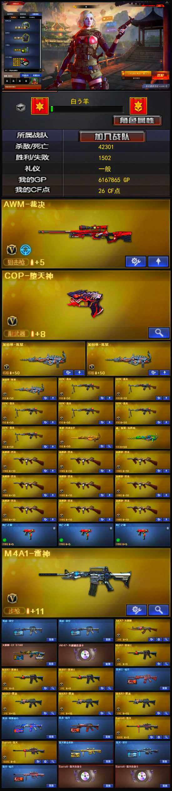 - [13080605]四川一区-68V-7王者-3炫金 【热门武器】:QBZ03-金色蔷薇,HK417-朱雀,M200-幻神,死亡之眼,M4A1-黑骑士,汤姆逊-烈龙*7,RPK-盘龙*3,沙鹰-修罗*6 【王者炫金武器】:炫金火麒麟,炫金毁灭,炫金修罗,王者之幻,王者之魂 【音效卡】:M200-幻神音效卡,AK47-火麒麟音效卡,M4A1-黑骑士音效卡,Barrett-毁灭音效卡 【稀有皮肤】:幻神-周瑜皮肤,雷神-能量核心*2,雷神-星空,火麒麟-AG战队皮肤,火麒麟-百城,毁灭-暗月,毁灭-黑大圣皮肤,天龙-秘银,天龙-能量核心,AWM-天龙-传奇白鲨,天神-暗月,屠龙-荣耀之锋 【角色】:王者-葵-貂蝉,王者之瞳,王者春,零-水下丽影,零,葵,蜀雪,青霞仙子 【人偶武器】:闪光弹-貂蝉,高爆手雷-大乔 【暴走生化】:死亡之眼,超级对讲机 【英雄级武器】:马来剑-夜魔,斩神刀-雷暴,M4A1-武圣,QBZ03-金色蔷薇,HK417-朱雀,M4A1-雷神*3,M4A1-黑龙,M4A1-玫瑰精灵,M4A1-黑骑士,M4A1-死神,RPK-盘龙*3,汤姆逊-烈龙*7,AK47-无影*2,AK47-火麒麟*2,AK47-黑武士,AK12-天启,AWM-天龙,Barrett-毁灭*3,Barrett-极光,AK47-机械迷城,AA-12-雷霆,M200-幻神,AK47-黑鲨,AK-47-猩红传说,AK47-B-战神,AK47-B-常胜将军,沙鹰-天神*2,沙鹰-修罗*6,麒麟刺,擎天*3,龙啸,屠龙*3 【特殊枪械】:1黑骑士,6烈龙,3盘龙