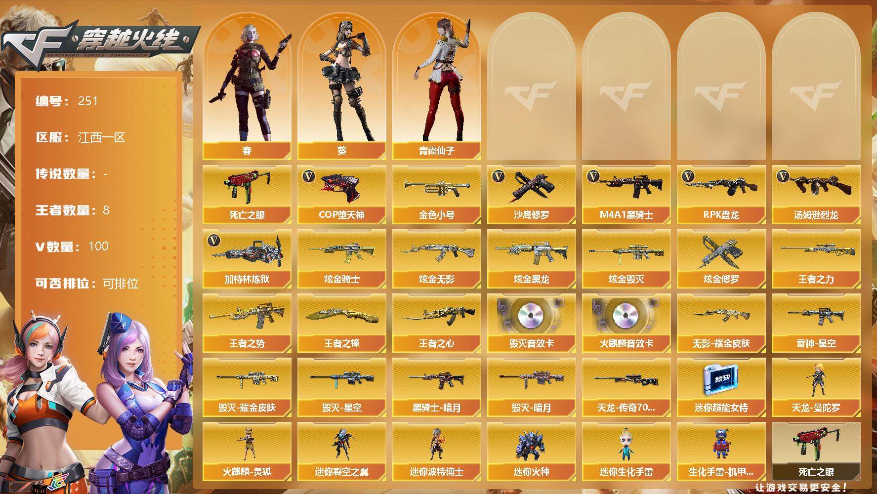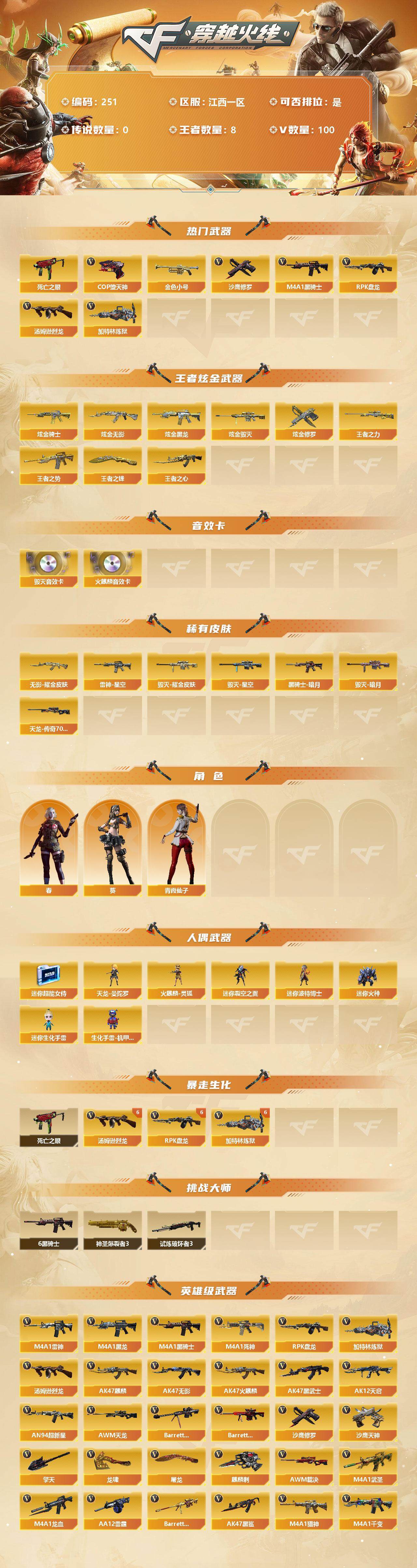 [13035058]【251】97V/100级/元帅/8王者/6炫金/3英雄/死亡之眼/金色小号/M4A1-黑骑士/汤姆逊-烈龙/RPK-盘龙/加特林-炼狱/COP-堕天神/沙鹰-修罗/炫金黑骑士/炫金无影/炫金黑龙/炫金毁灭/炫金修罗/王者之势/王者之力/王者之心/王者之锋/AK47-火麒麟音效卡/Barrett-毁灭音效卡/雷神-星空/黑骑士-暗月/毁灭-暗月/毁灭耀金皮肤/毁灭-星空/AWM-天龙-传奇70KG/无影耀金皮肤/葵/春/青霞仙子/天龙-曼陀罗/火麒麟-灵狐/迷你超能女侍/迷你裂空之翼/迷你波特博士/迷你火种/迷你生化手雷/生化手雷-机甲核心/6烈龙/6盘龙/6炼狱/神圣爆裂者/试炼破坏者/6黑骑士/马来剑夜魔/M4A1-武圣/M4A1-雷神/M4A1-黑龙/M4A1-死神/AK47-麒麟/AK47-无影/AK47-火麒麟/AK47-黑武士/AK12-天启/AN94-超新星/AWM-天龙/Barrett-毁灭/Barrett-极光/AWM-裁决/M4A1-龙血/AA-12-雷霆/Barrett-朱雀/AK47-黑鲨/M4A1-猎神/M4A1-千变/沙鹰-天神/麒麟刺/擎天/龙啸/屠龙