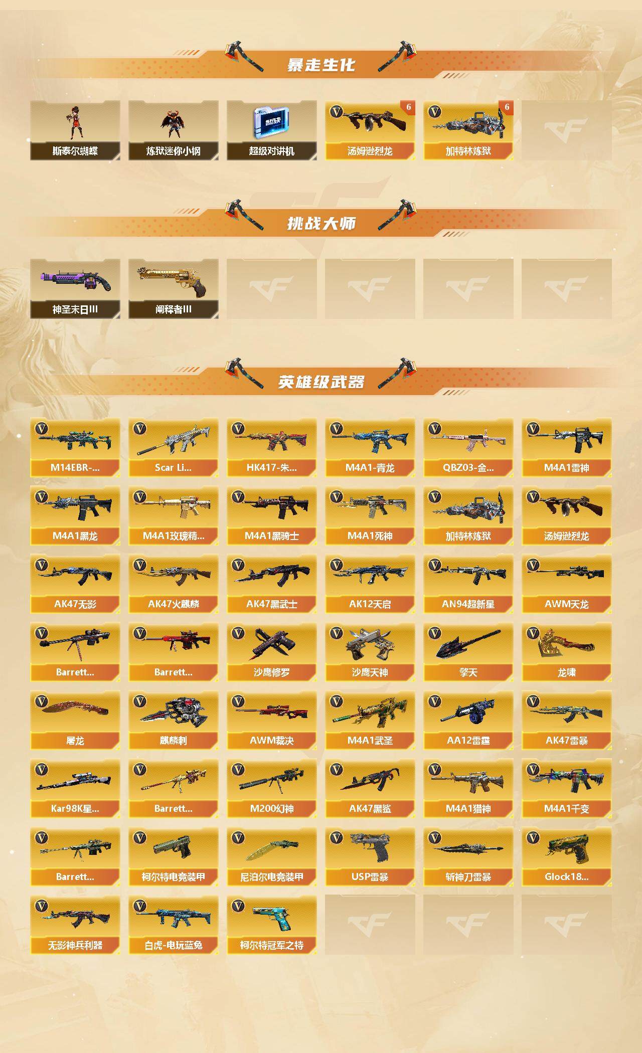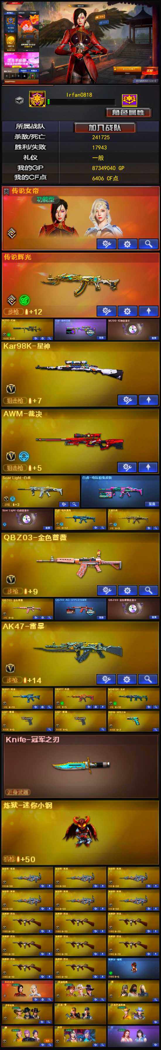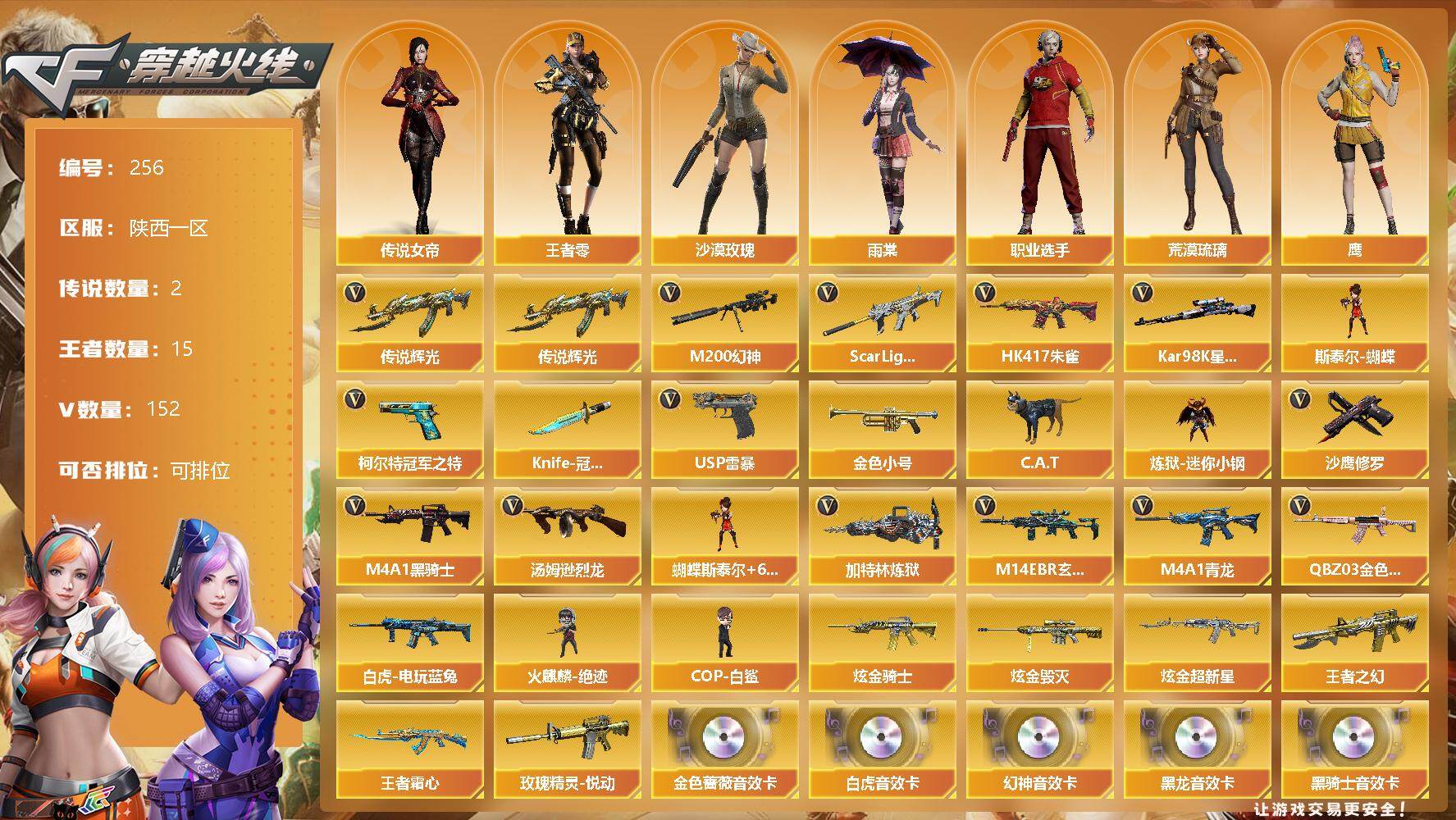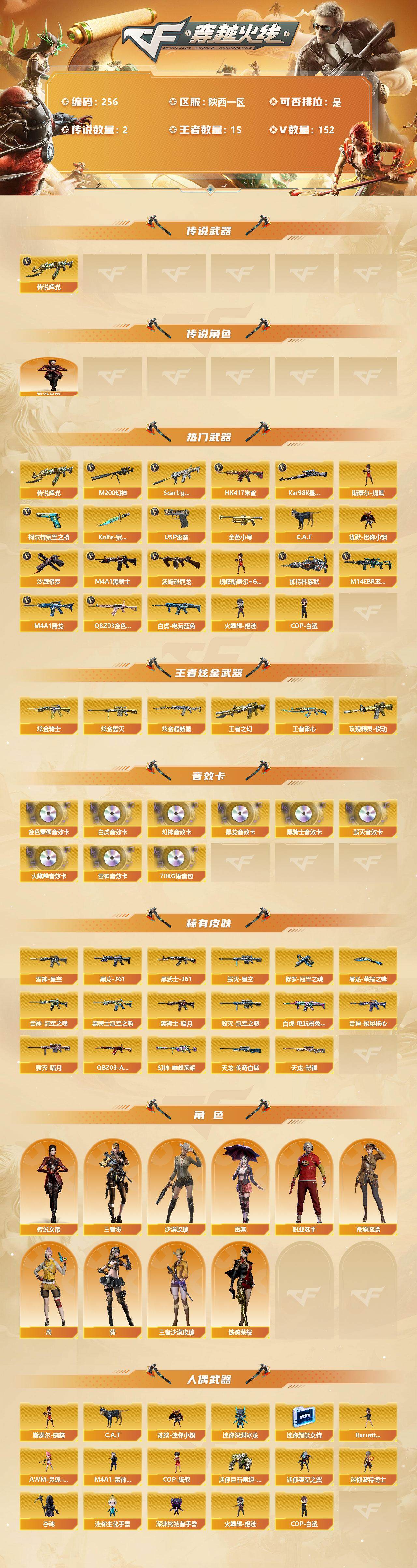 [13035089]【256】147V/102级/荣耀元首/2传说/15王者/3炫金/5英雄/传说辉光/传说女帝/QBZ03-金色蔷薇/M14EBR-玄武/Scar Light-白虎/HK417-朱雀/M4A1青龙/M200-幻神/白虎-电玩蓝兔/柯尔特-冠军之特/Kar98k-星神/金色小号/C.A.T/炼狱-迷你小钢/M4A1-黑骑士/汤姆逊-烈龙/加特林-炼狱/斯泰尔蝴蝶/火麒麟-绝迹/COP-白鲨/USP雷暴/沙鹰-修罗/Knife-冠军之刃/蝴蝶斯泰尔+6烈龙/炫金黑骑士/炫金毁灭/炫金超新星/王者之幻/玫瑰精灵-悦动/王者霜心/M200-幻神音效卡/AK47-火麒麟音效卡/M4A1-雷神音效卡/M4A1-黑龙音效卡/M4A1-黑骑士音效卡/Barrett-毁灭音效卡/金色蔷薇音效卡/白虎音效卡/70KG语音包/幻神-巅峰荣耀/白虎-电玩粉兔/QBZ03-AG-CFPLS19冠军/雷神-能量核心/雷神-星空/雷神冠军之魄/黑骑士-暗月/黑骑士-冠军之势/M4A1-黑龙-361/毁灭-暗月/毁灭-星空/毁灭-冠军之怒/天龙-秘银/AWM-天龙-传奇白鲨/AK47-黑武士-361/修罗-冠军之魂/屠龙-荣耀之锋/王者-零/王者-沙漠玫瑰/葵/沙漠玫瑰/雨棠/鹰/荒漠琉璃/铁骑荣耀/职业选手/Barrett-夜玫瑰/AWM-灵狐-15周年嘉年华/M4A1-雷神-精英刀锋/COP-旗袍/迷你深渊冰龙/迷你超能女侍/迷你巨石泰坦-魔花研究所/迷你裂空之翼/迷你波特博士/夺魂/迷你生化手雷/深渊终结者手雷/超级对讲机/6烈龙/6炼狱/神圣爆裂者-末日/阐释者/Barrett-电竞装甲/柯尔特-电竞装甲/尼泊尔-电竞装甲/AK47-雷暴/斩神刀-雷暴/M4A1-武圣/Glock18-武圣/无影-神兵利器/M4A1-雷神/M4A1-黑龙/M4A1-玫瑰精灵/M4A1-死神/AK47-无影/AK47-火麒麟/AK47-黑武士/AK12-天启/AN94-超新星/AWM-天龙/Barrett-毁灭/Barrett-极光/AWM-裁决/AA-12-雷霆/Barrett-朱雀/AK47-黑鲨/M4A1-猎神/M4A1-千变/沙鹰-天神/麒麟刺/擎天/龙啸/屠龙