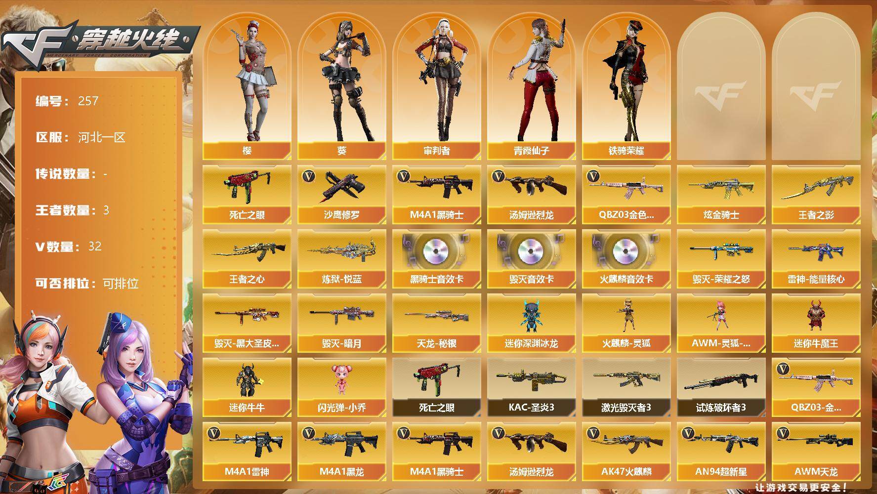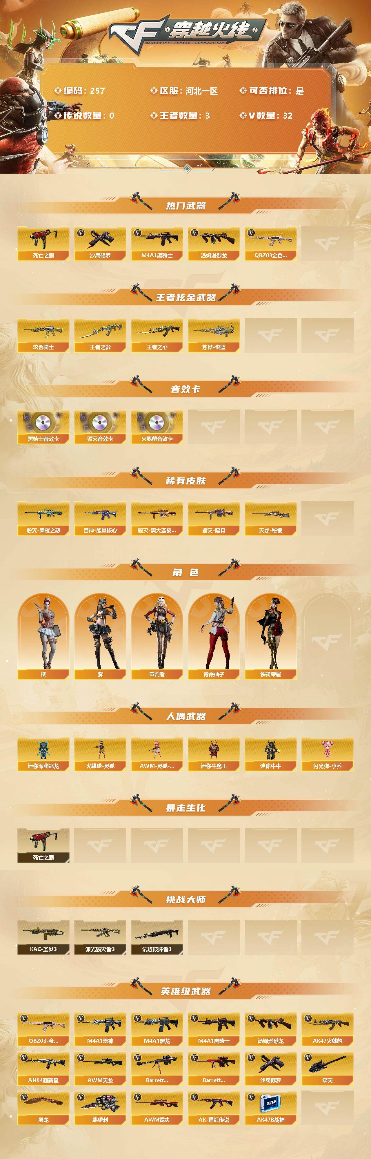 [13035110]【257】29V/102级/荣耀元首/3王者/1炫金/3英雄/QBZ03-金色蔷薇/死亡之眼/M4A1-黑骑士/汤姆逊-烈龙/沙鹰-修罗/炫金黑骑士/炼狱-悦蓝/王者之影/王者之心/AK47-火麒麟音效卡/M4A1-黑骑士音效卡/Barrett-毁灭音效卡/雷神-能量核心/毁灭-暗月/毁灭-荣耀之怒/毁灭-黑大圣皮肤/天龙-秘银/审判者/葵/樱/铁骑荣耀/青霞仙子/火麒麟-灵狐/AWM-灵狐-15周年嘉年华/迷你深渊冰龙/迷你牛魔王/迷你牛牛/闪光弹-小乔/KAC-圣炎切割者/试炼破坏者/激光毁灭者/M4A1-雷神/M4A1-黑龙/AK47-火麒麟/AN94-超新星/AWM-天龙/Barrett-毁灭/Barrett-极光/AWM-裁决/AK-47-猩红传说/AK47-B-战神/麒麟刺/擎天/屠龙