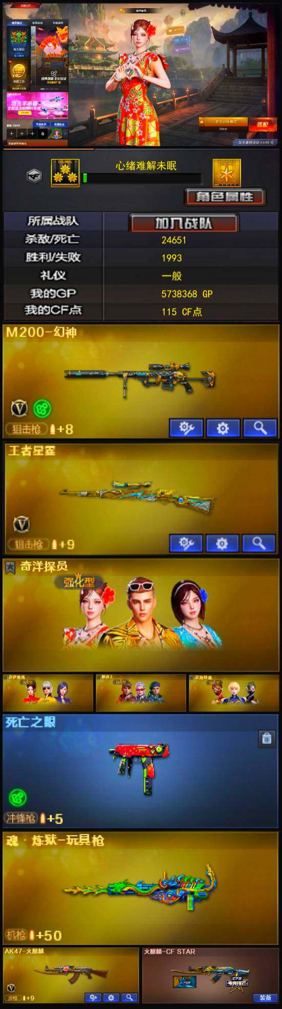 - [12085980]【商品标题】:云南一区-47V-8王者-0炫金 【热门武器】:QBZ03-金色蔷薇,M200-幻神,M4A1-黑骑士,汤姆逊-烈龙,沙鹰-修罗*4 【音效卡】:M4A1-黑骑士音效卡,Barrett-毁灭音效卡,AWM-裁决音效卡 【稀有皮肤】:幻神-周瑜皮肤,幻神-AG-CFPLS17冠军,M200-幻神-荣耀世冠白鲨,QBZ03-荣耀世冠白鲨,雷神-虎将,雷神-荣耀世冠AG,火麒麟-心动糖果,黑骑士-冠军之势,毁灭-星空,毁灭-SV-CFPLS16冠军,屠龙-星火燎原,龙啸-冠军之啸 【角色】:王者春,蜀雪,铁骑荣耀,职业选手 【人偶武器】:AWM-灵狐-15周年嘉年华,迷你超能女侍,灵狐娃娃手雷,闪光弹-貂蝉,高爆手雷-大乔 【暴走生化】:黑龙吞噬者,超级对讲机 【英雄级武器】:闪光弹-竞技荣光*2,幻灵之锋*2,麒麟刺-堕天神*2,QBZ03-金色蔷薇,无影-神兵利器,M4A1-雷神,M4A1-黑骑士,汤姆逊-烈龙,AK47-麒麟,AK12-天启,AWM-裁决,M200-幻神,黑武士-锦绣游龙,AK-47-猩红传说*3,AK47-B-战神,AK47-B-常胜将军,沙鹰-天神*2,沙鹰-修罗*4,龙啸,屠龙 【特殊枪械】:1黑骑士,1烈龙
