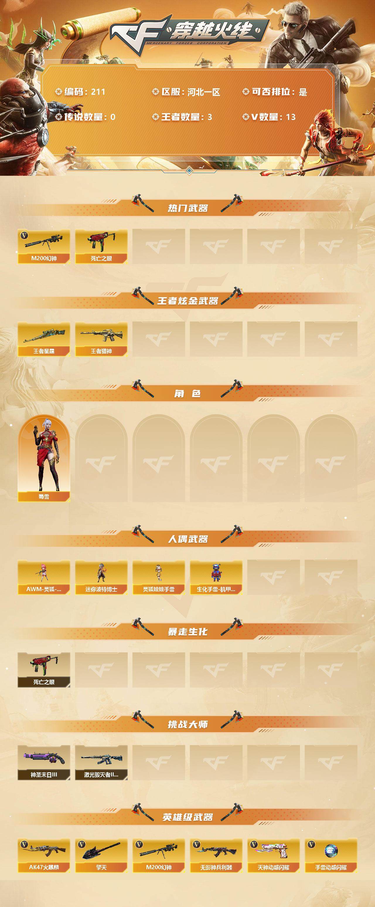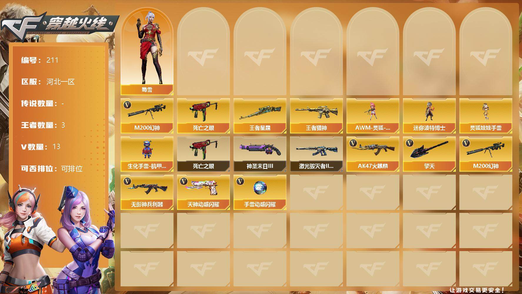 [13034944]【211】13V/75级/校官/3王者/M200-幻神/死亡之眼/王者猎神/王者星霆/蜀雪/AWM-灵狐-15周年嘉年华/迷你波特博士/灵狐娃娃手雷/生化手雷-机甲核心/神圣爆裂者-末日/激光毁灭者III-白马银枪/天神-动感闪耀/手雷-动感闪耀/无影-神兵利器/AK47-火麒麟/擎天
