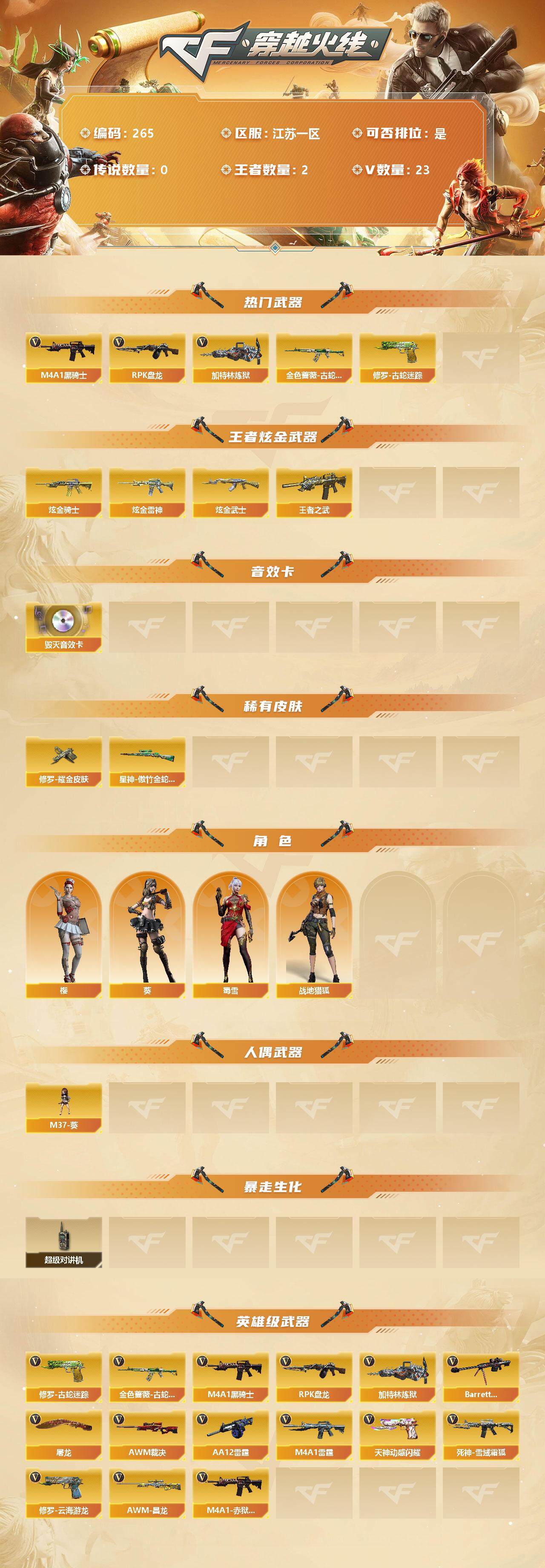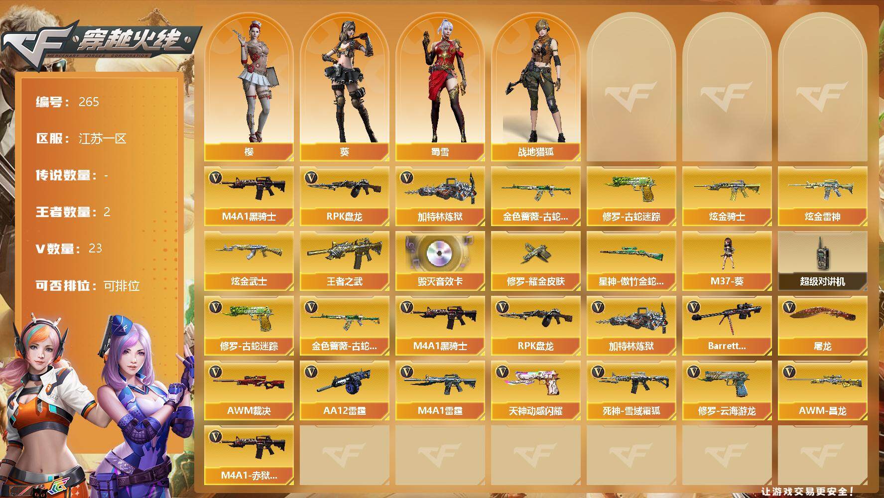 [13035231]【265】19V/101级/大元首/2王者/3炫金/4英雄/金色蔷薇-古蛇迷踪/修罗-古蛇迷踪/M4A1-黑骑士/RPK-盘龙/加特林-炼狱/炫金黑骑士/炫金雷神/炫金黑武士/王者之武/Barrett-毁灭音效卡/星神-傲竹金蛇/修罗耀金皮肤/葵/樱/战地猎狐/蜀雪/M37-葵/超级对讲机/M4A1-雷霆/天神-动感闪耀/Barrett-毁灭/AWM-裁决/AA-12-雷霆/死神-雪域霜狐/AWM-昌龙/M4A1-赤狱骑士/修罗-云海游龙/屠龙