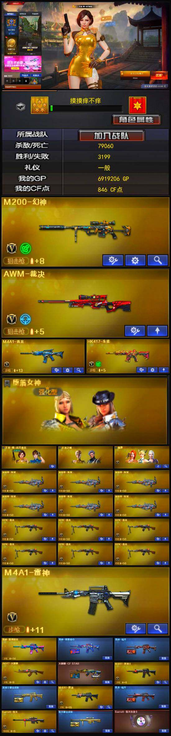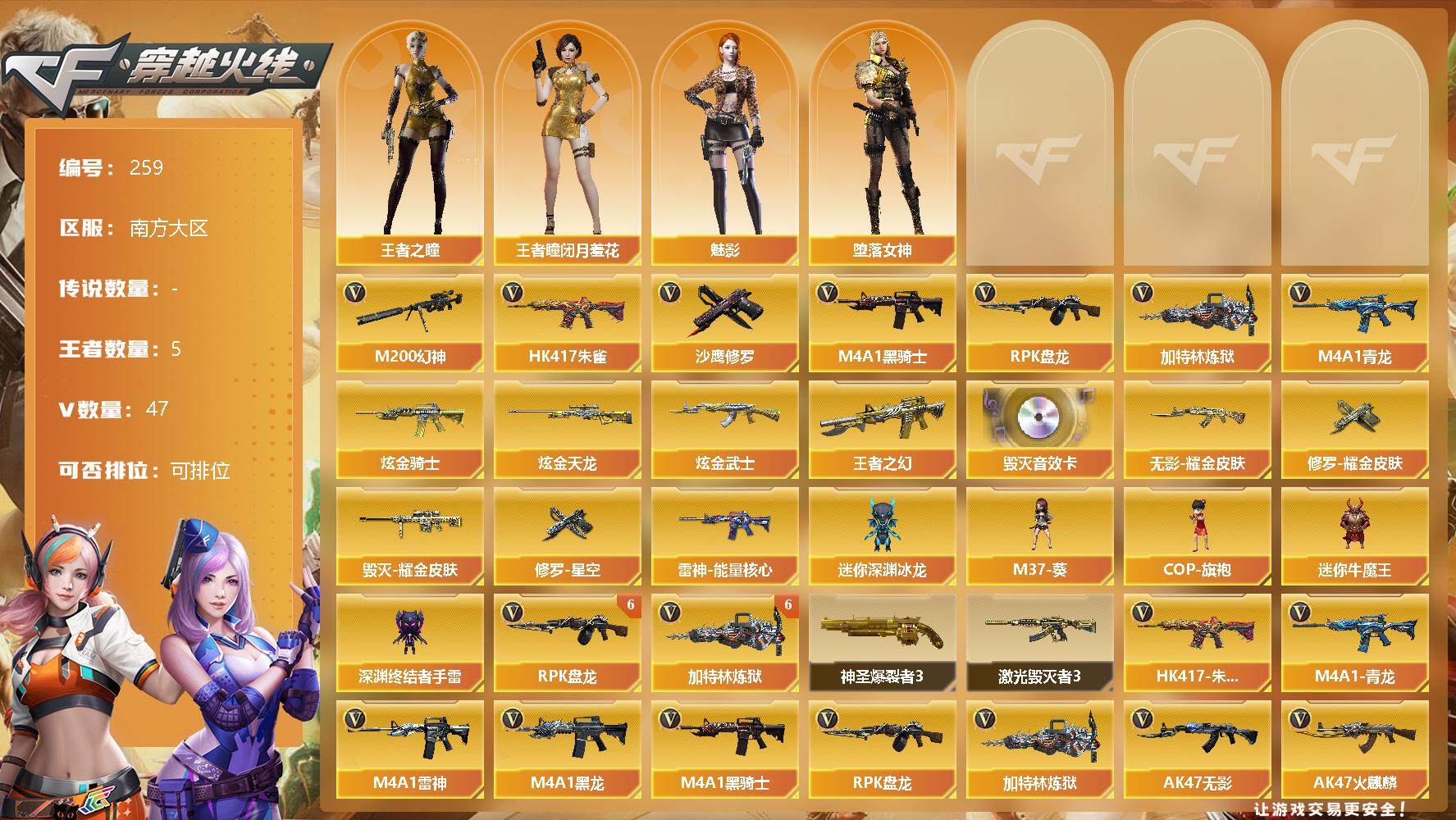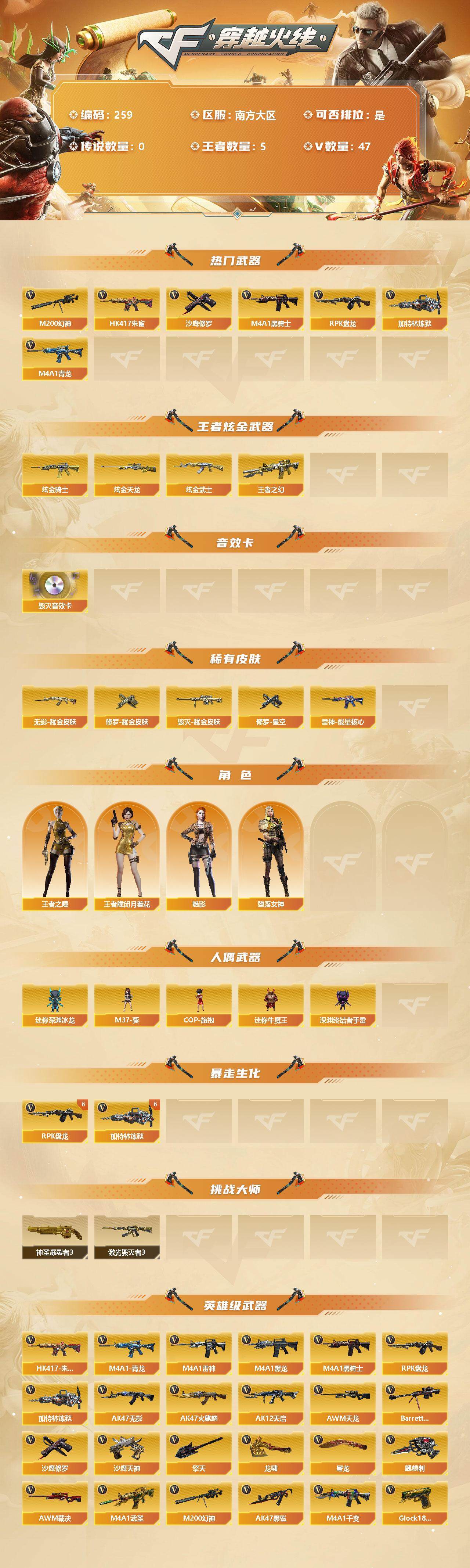 [13035174]【259】46V/100级/元帅/5王者/4炫金/1英雄/HK417-朱雀/M4A1青龙/M200-幻神/M4A1-黑骑士/RPK-盘龙/加特林-炼狱/沙鹰-修罗/炫金黑骑士/炫金天龙/炫金黑武士/王者之幻/Barrett-毁灭音效卡/雷神-能量核心/毁灭耀金皮肤/无影耀金皮肤/修罗耀金皮肤/修罗-星空/王者-瞳-闭月羞花/王者之瞳/堕落女神/魅影/M37-葵/COP-旗袍/迷你深渊冰龙/迷你牛魔王/深渊终结者手雷/6盘龙/6炼狱/神圣爆裂者/激光毁灭者/M4A1-武圣/Glock18-武圣/M4A1-雷神/M4A1-黑龙/AK47-无影/AK47-火麒麟/AK12-天启/AWM-天龙/Barrett-毁灭/AWM-裁决/AK47-黑鲨/M4A1-千变/沙鹰-天神/麒麟刺/擎天/龙啸/屠龙