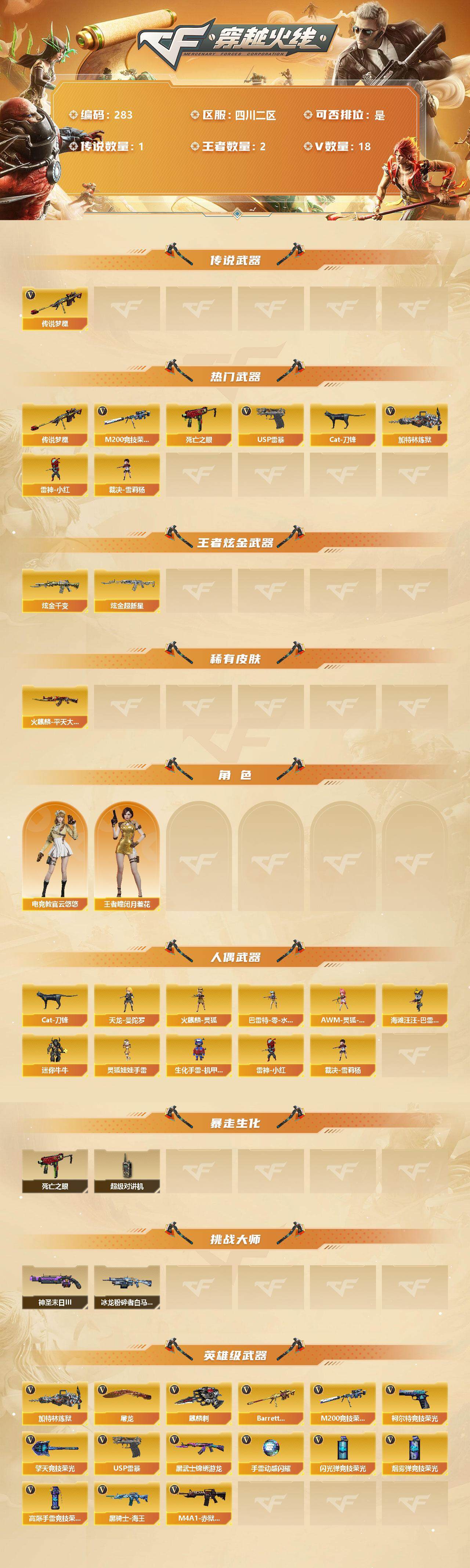 - [12657028]山东一区-16V-3王者-0炫金 【传说武器】:传说破晓 【传说角色】:传说影煞 【热门武器】:传说破晓,G36C-幻影,M200-幻神,炽芒蝶刃 【王者炫金武器】:王者星霆 【稀有皮肤】:幻神-电流骇客 皮肤,毁灭-黑大圣皮肤 【角色】:传说影煞,零-水下丽影,战地猎狐,铁骑荣耀 【人偶武器】:AWM-灵狐-15周年嘉年华,生化手雷-机甲核心 【挑战大师】:冰龙粉碎者-白马银枪 【英雄级武器】:G36C-幻影,Barrett-毁灭,M200-幻神,死神-雪域霜狐,M4A1-赤狱骑士,沙鹰-天神*4,炽芒蝶刃,龙啸-热带奇洋 【特殊枪械】: